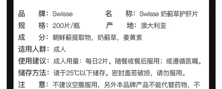 【保税】澳洲swisse 护肝片 护肝宁高浓度奶蓟草护肝宁熬夜之选 60粒/120粒/200粒 醒酒解酒神器