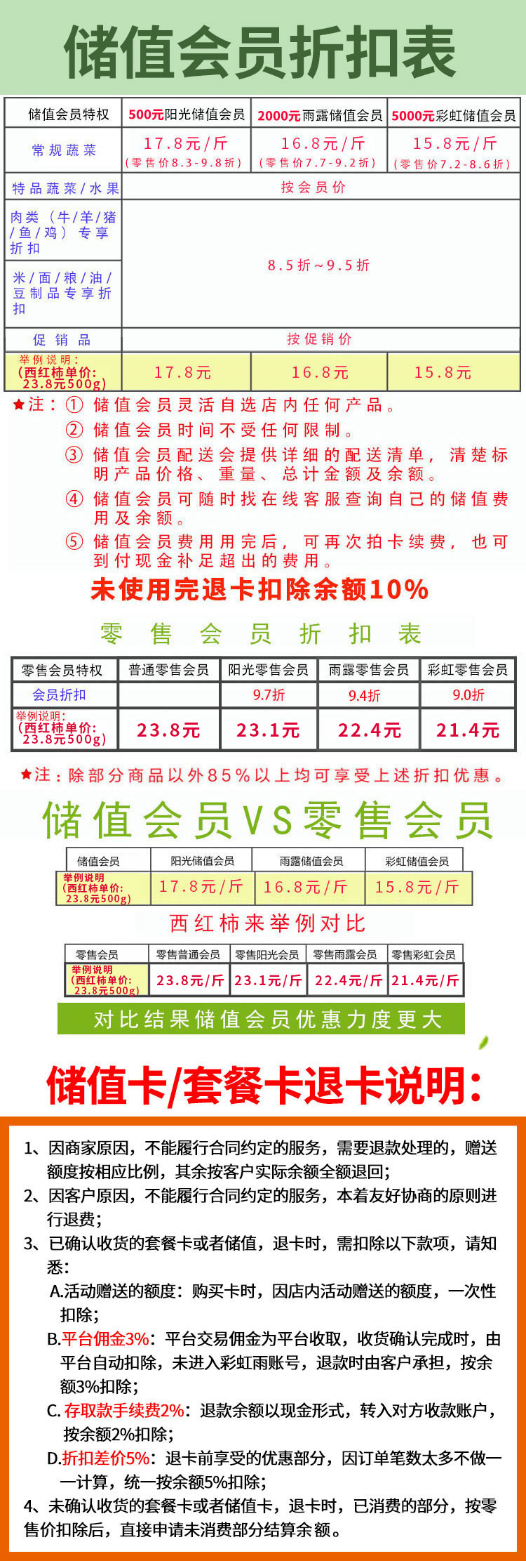 储值金额作为储值费用,会员可按照会员价自选店内的所以产品(蔬菜、水果、鱼肉蛋奶、米面粮油等),按照自选的品种、份数计算费用用完为止。