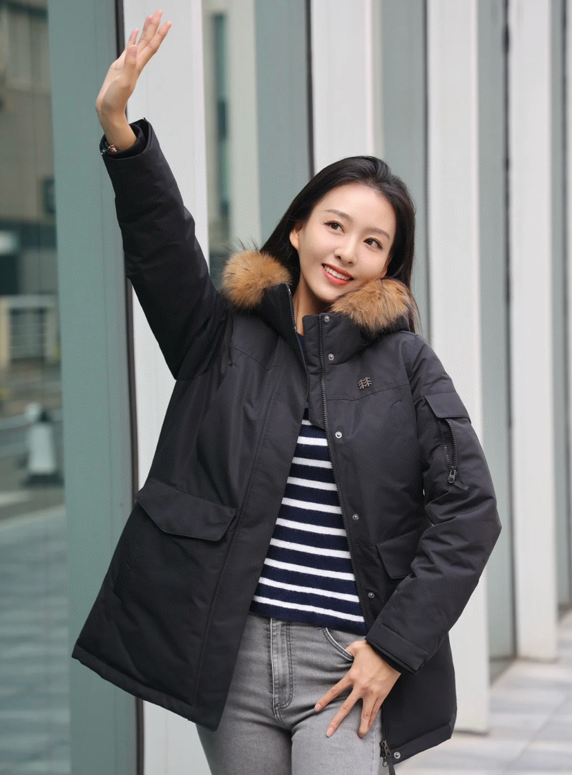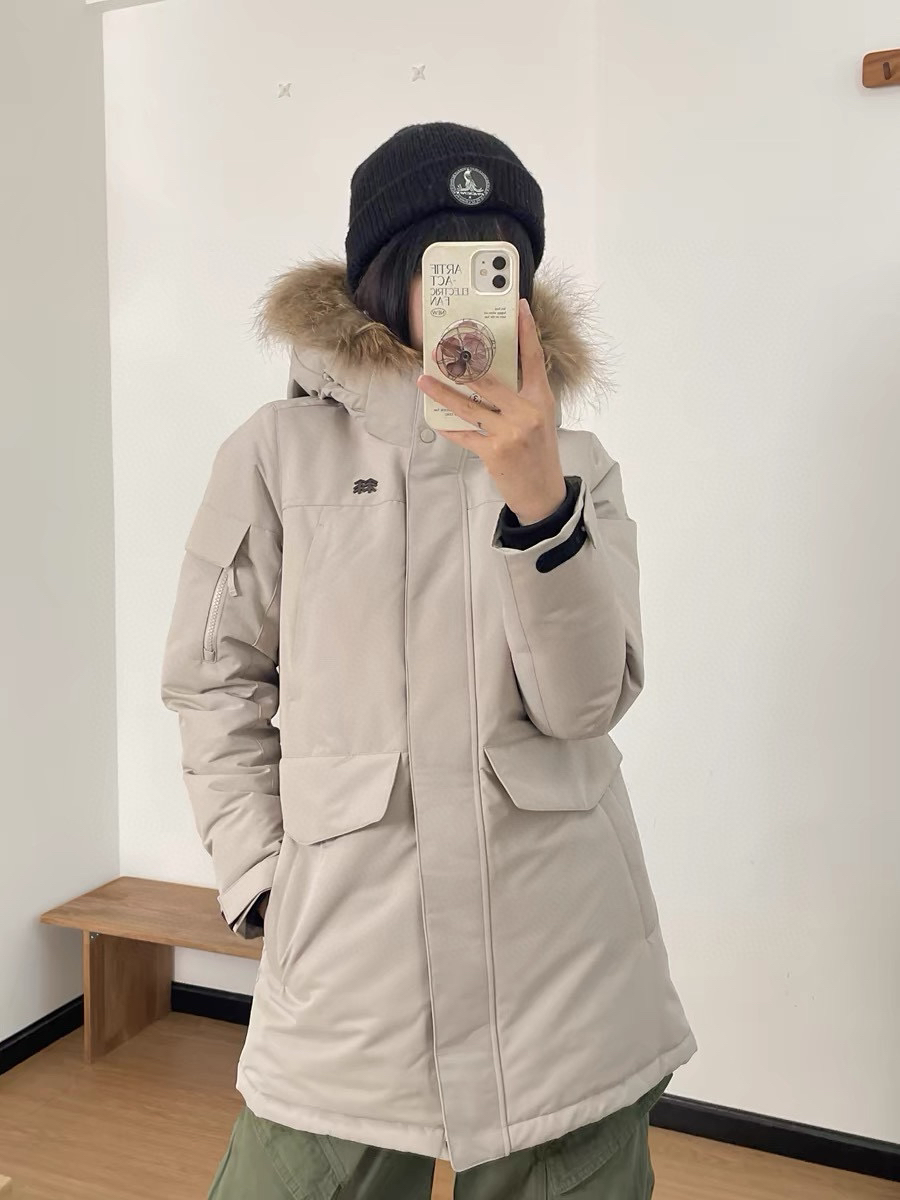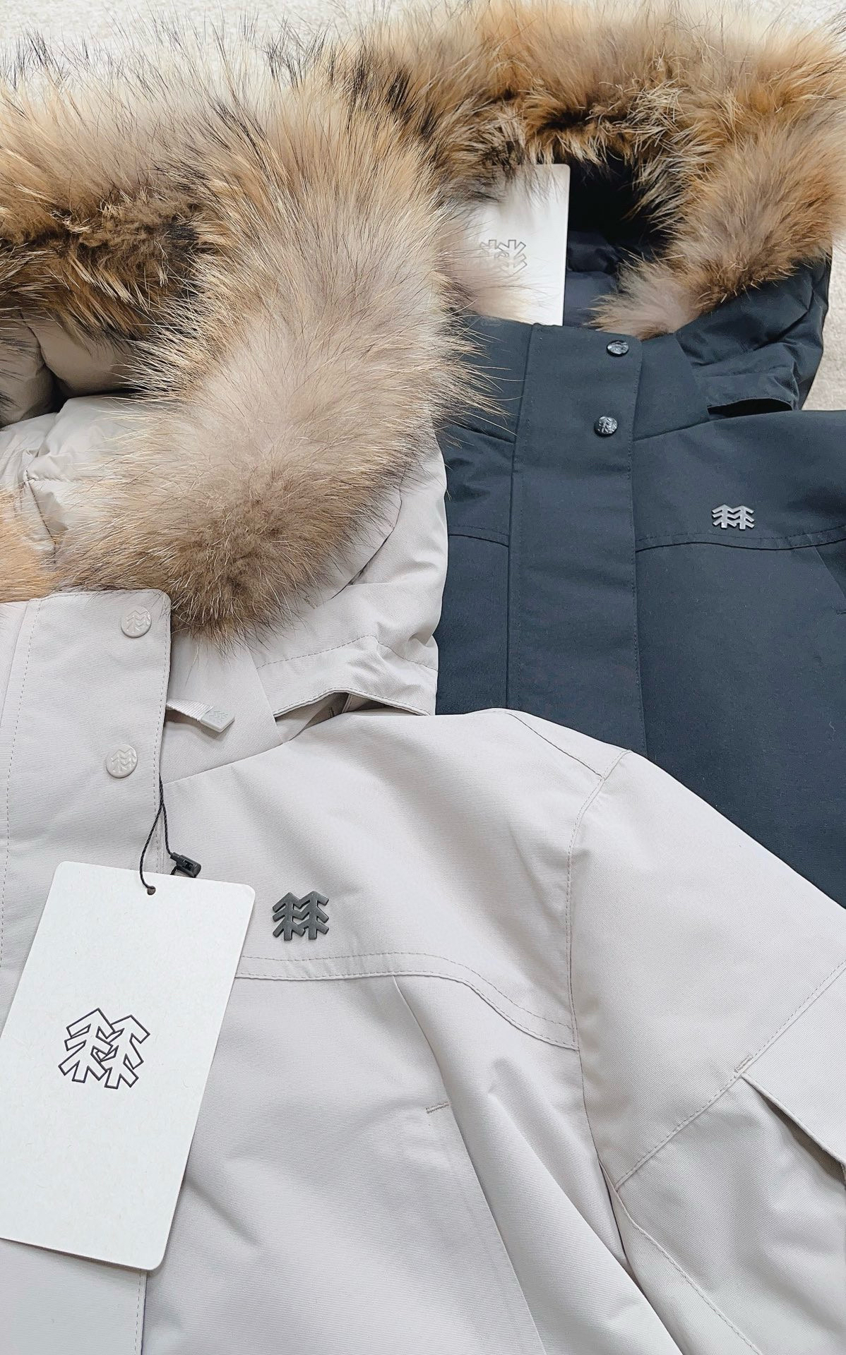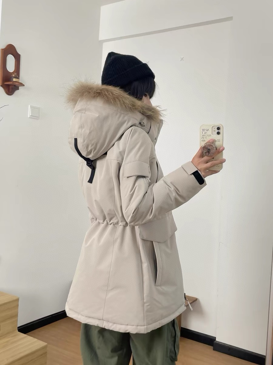 很像大鹅的版型对不,但是比大鹅轻盈许多许多嗷。貉子毛领丰盈蓬又松保暖。外防层雨防风,透气轻盈的专用材质。