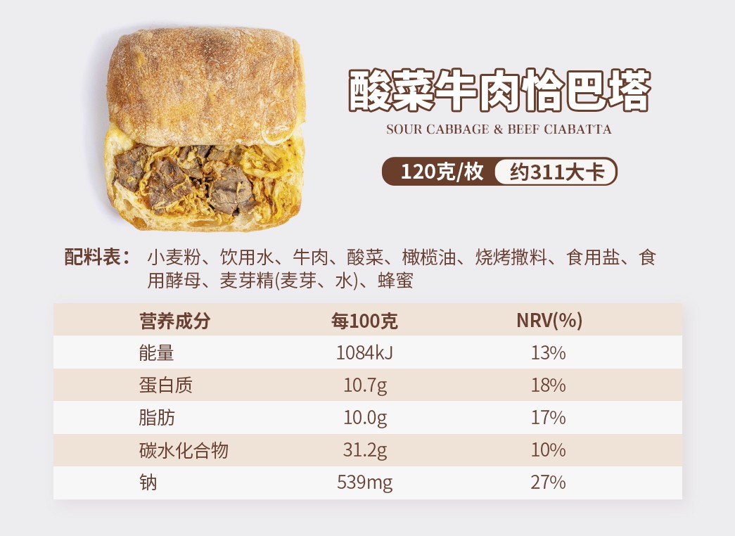 重点夸夸这干净到 “比脸还纯” 的配料表,无蔗糖无代糖、无蛋无奶,只有小麦粉、饮用水、牛肉,酸菜,橄榄油,烧烤撒料,食用盐,食用酵母,麦芽精,蜂蜜这些基础原料(麦芽精纯纯助力发酵,让外皮更脆、色泽更绝 )