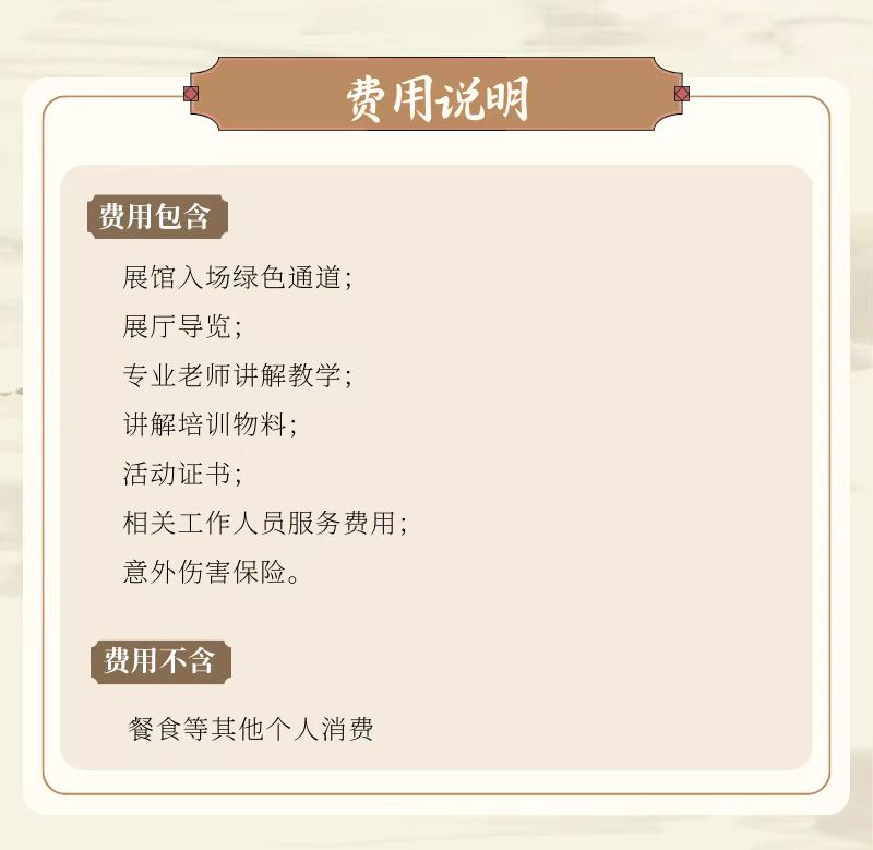 展馆入场绿色通道,展厅导览,专业老师讲解教学,讲解培训物料,活动证书,相关工作人员服务费用,意外伤害保险。