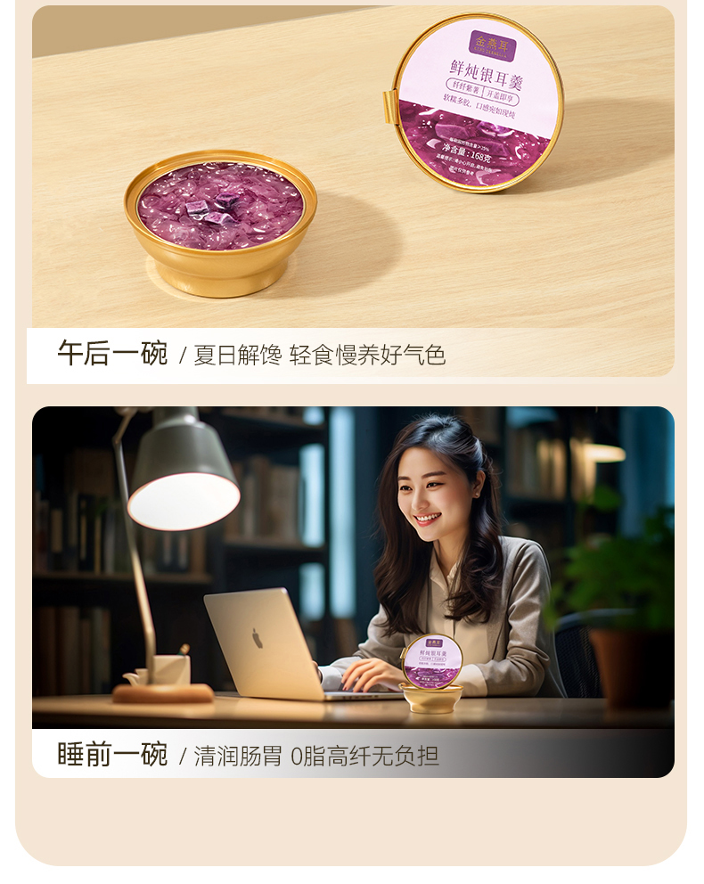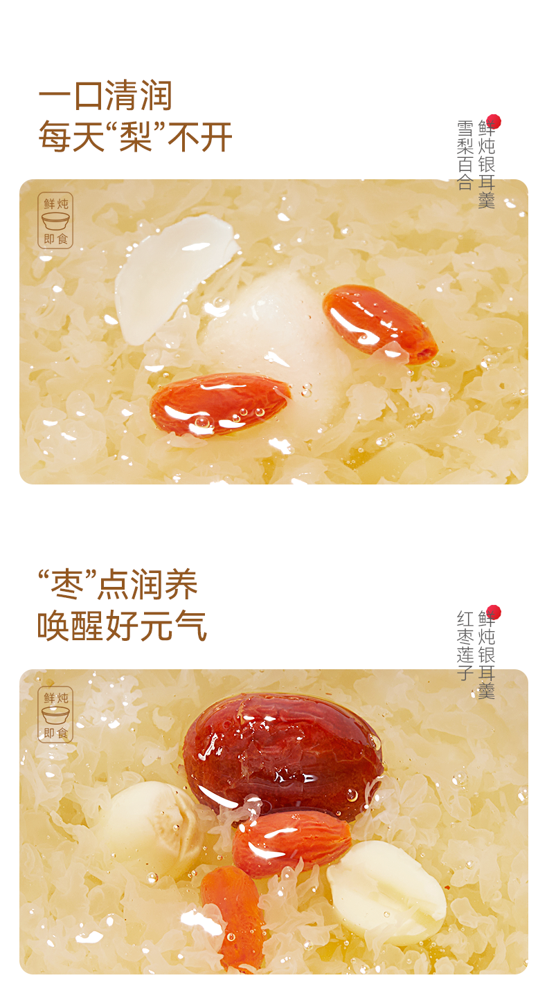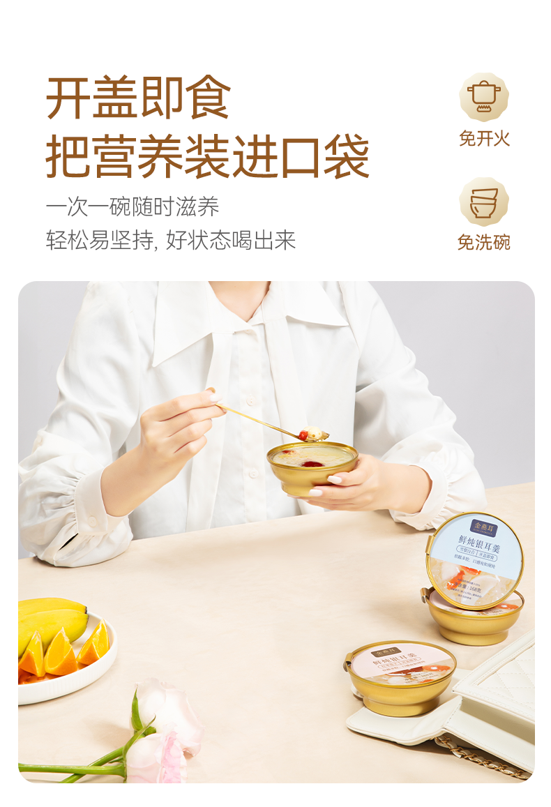 金燕耳·鲜炖银耳羹 “小金碗”,甄选高山生态鲜银耳,叠加多种健康食材,0脂、轻负担,1碗鲜炖银耳羹≈42大卡,一顿正餐≈650大卡