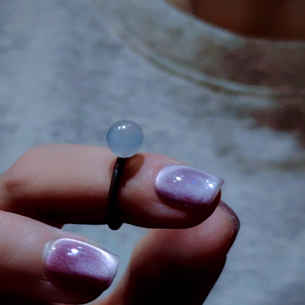 戒托以银为基底,经电镀黑金工艺淬炼,利落的几何线条勾勒出纯粹轮廓,喷砂工艺突出了深沉的哑光光泽与翡翠白珠形成克制而精妙的对比。摒弃繁杂装饰,仅以流畅的托举镶嵌糯种翡翠珠子,极简设计将天然婉约之美烘托至极致,每一处细节都彰显着“少即是多”的设计哲学。