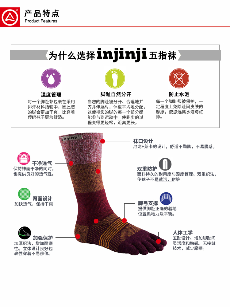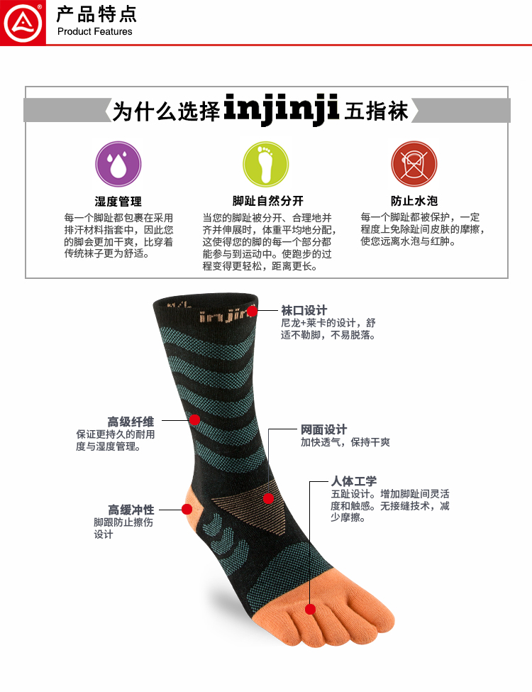 INJINJI五指袜 长筒越野路跑袜 户外徒步 越野跑 旅行耐磨袜 路跑
