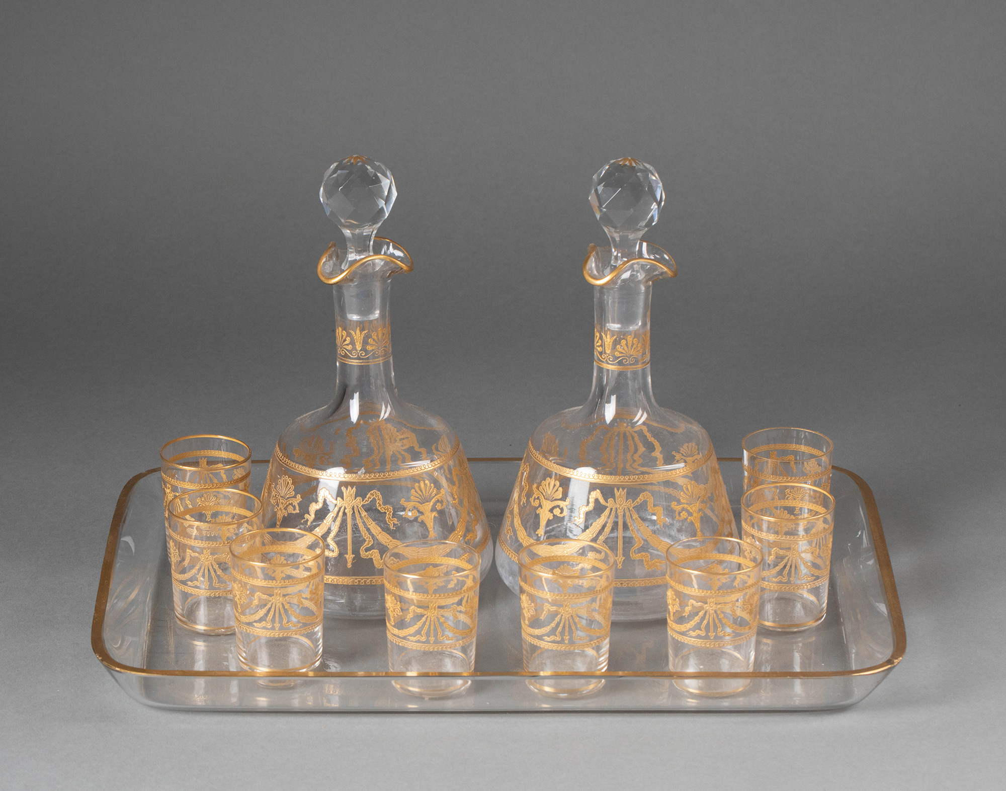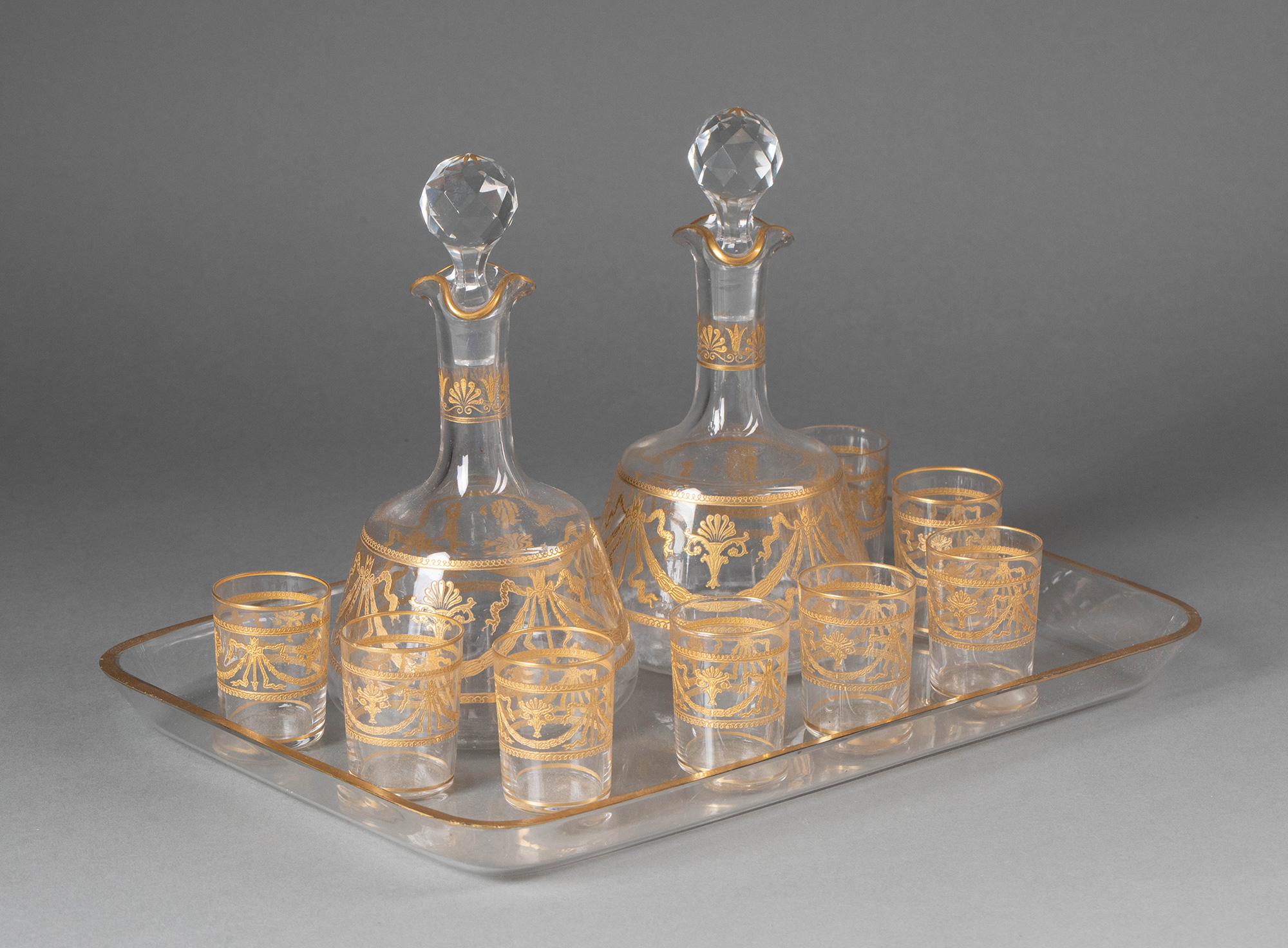 独角鹿西洋古董19世纪末20世纪初法国著名水晶工坊圣路易出品24K描金修饰Congress花纹款精雕水晶酒具套件
