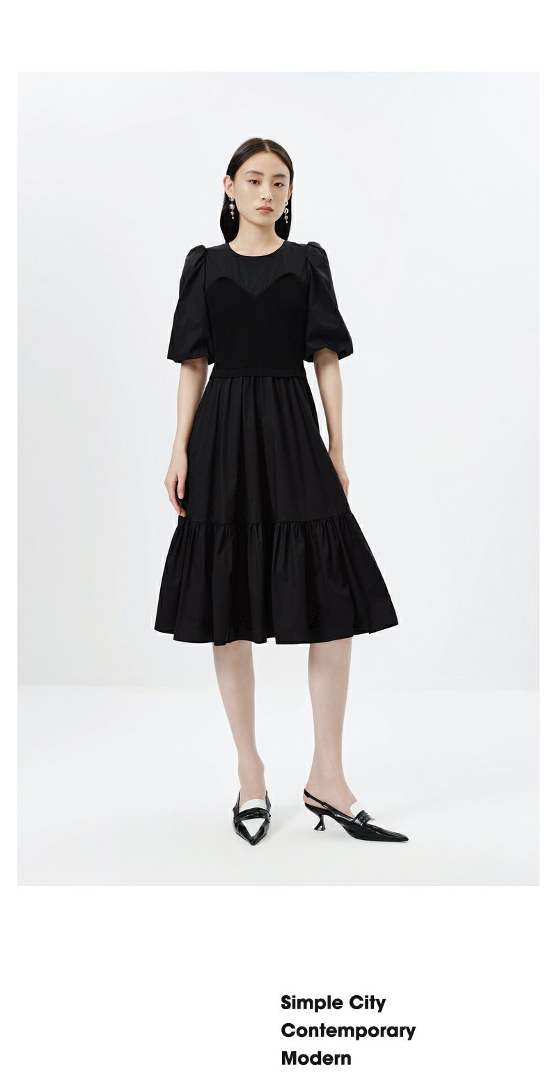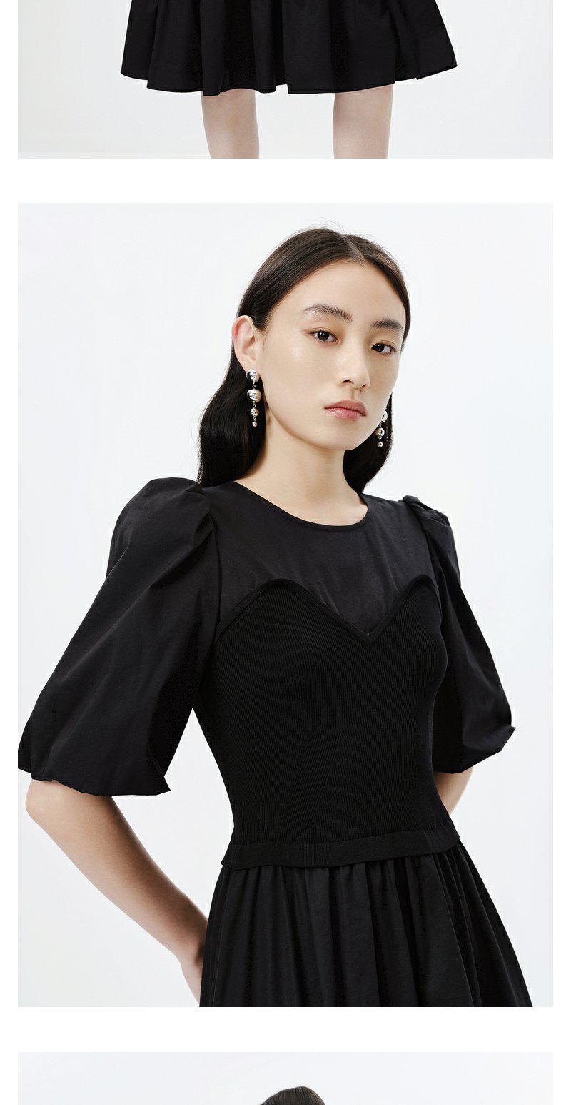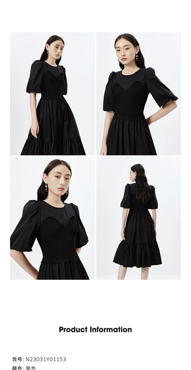 NEELLY纳俪商场同款圆领春季黑色法式连衣裙女针织拼接A字大摆裙N23031Y01153