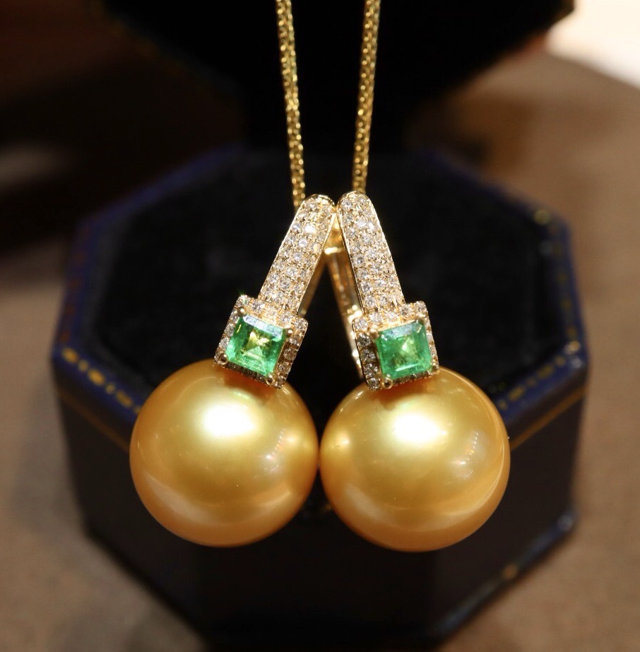 519025 天然南洋金珍珠耳环 18k金钻石祖母绿厚金镶嵌,珠子圆珠浓金强光几乎完美,精致轻奢款 大小13.2mm 超值价💰9000/对