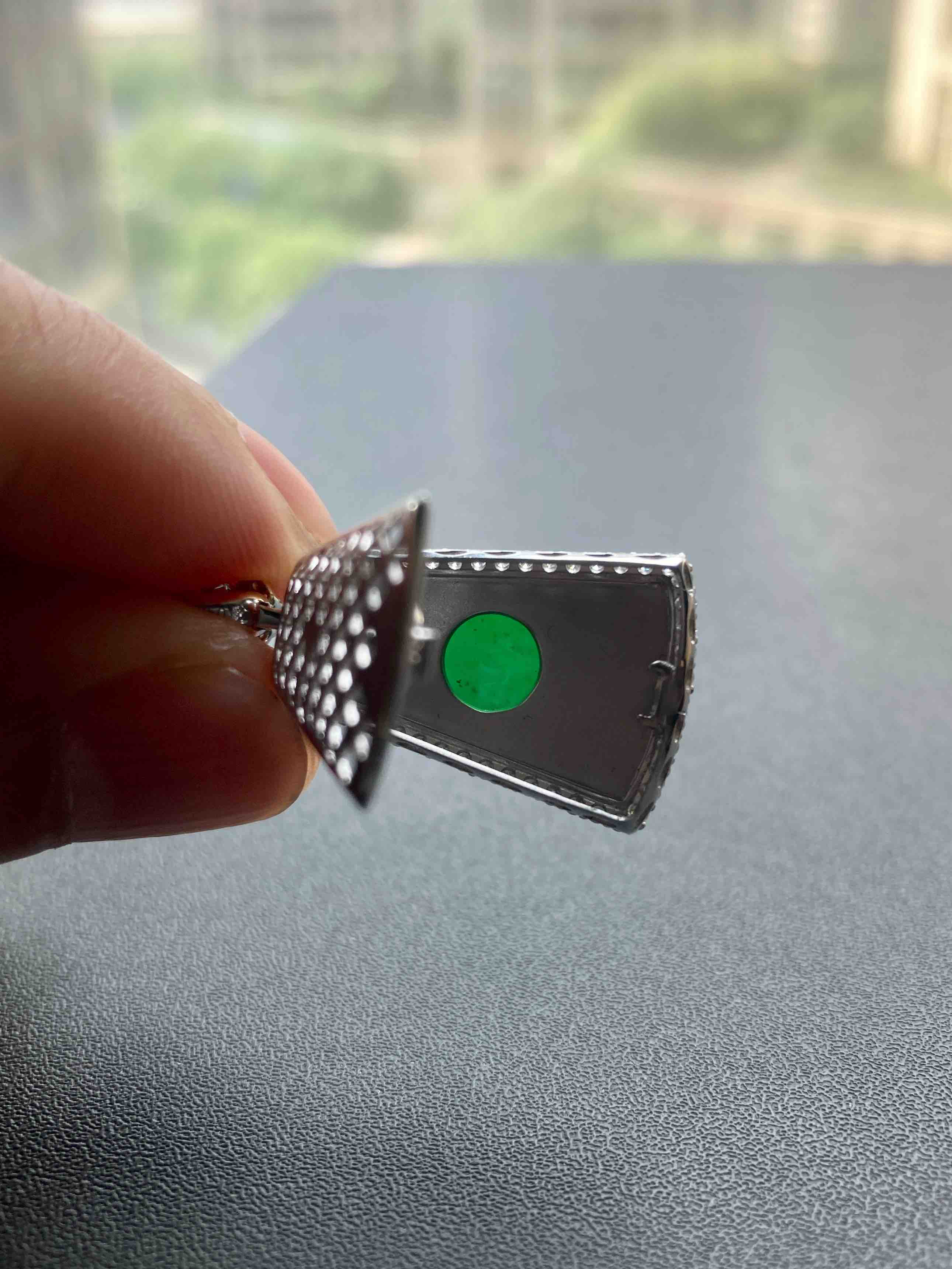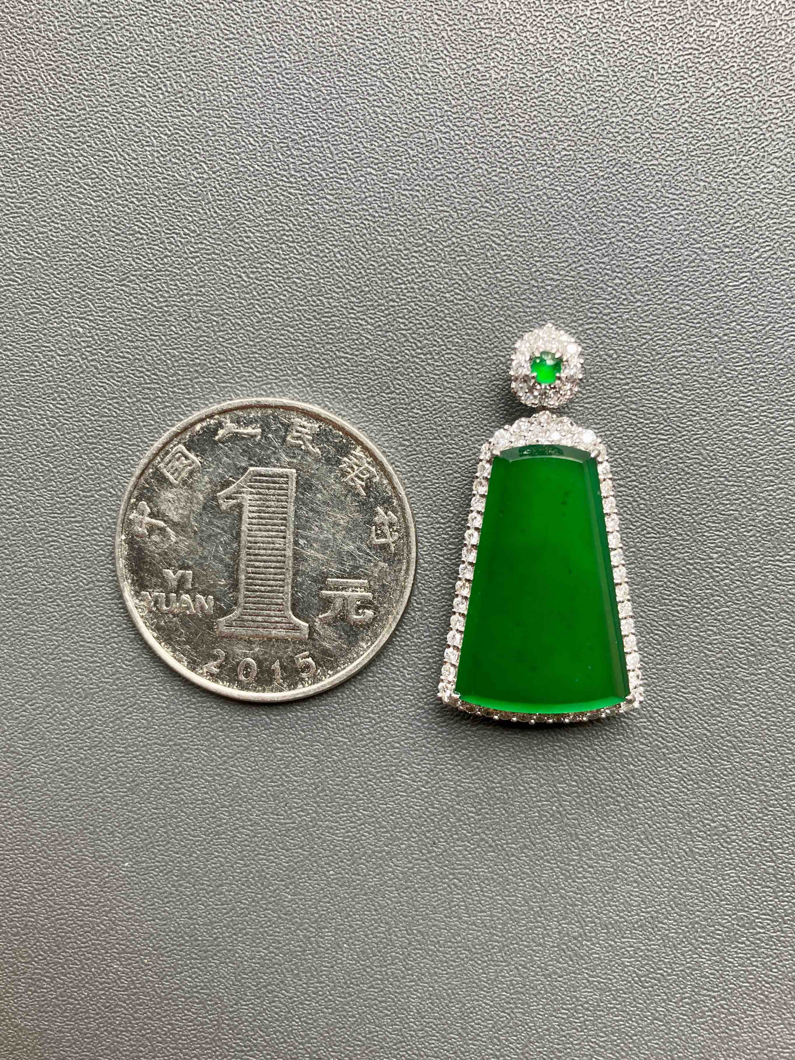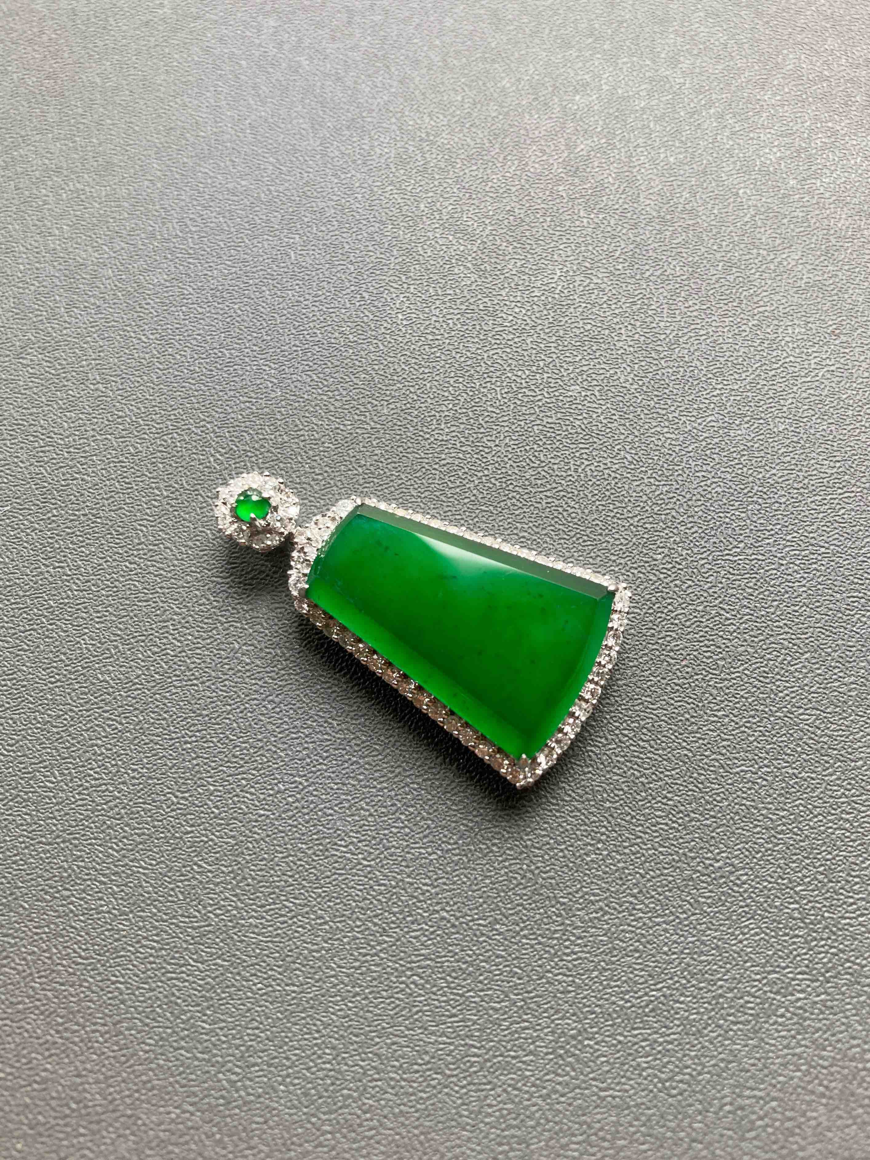 上次没抢到的今天赶紧,高冰种阳绿翡翠无事牌,色标级正阳绿,艳丽无比,实在太稀有,种水晶莹剔透,18k白金钻石镶嵌,后开盖,翡翠里的高档品类,保平安之物,无瑕疵的料子才能做光面无雕,一块这么大的阳绿平安无事牌,同料只做了两个,现在这是最后的机会,20.8×14×2mm,镶嵌后31×16.2×7.3mm