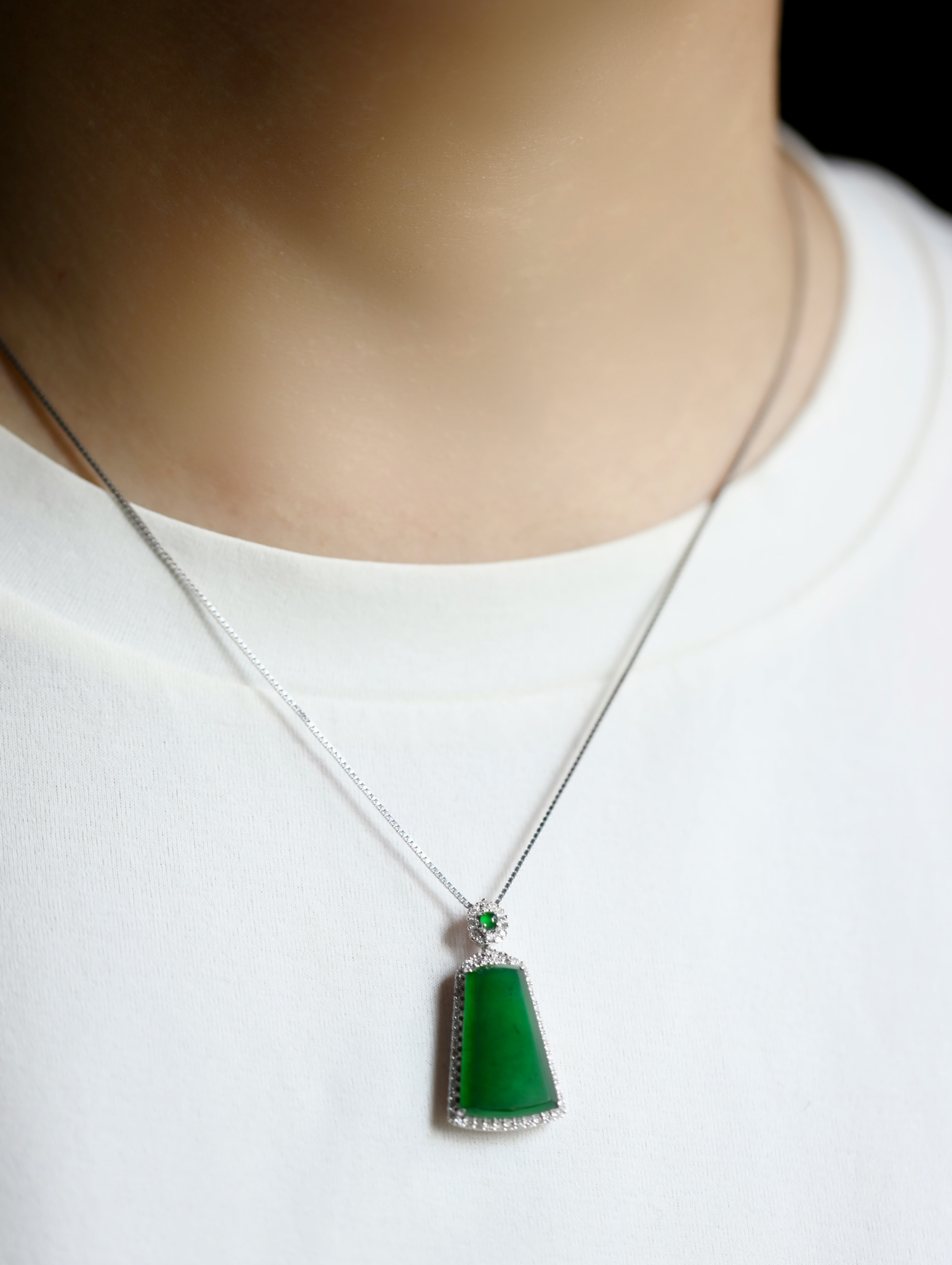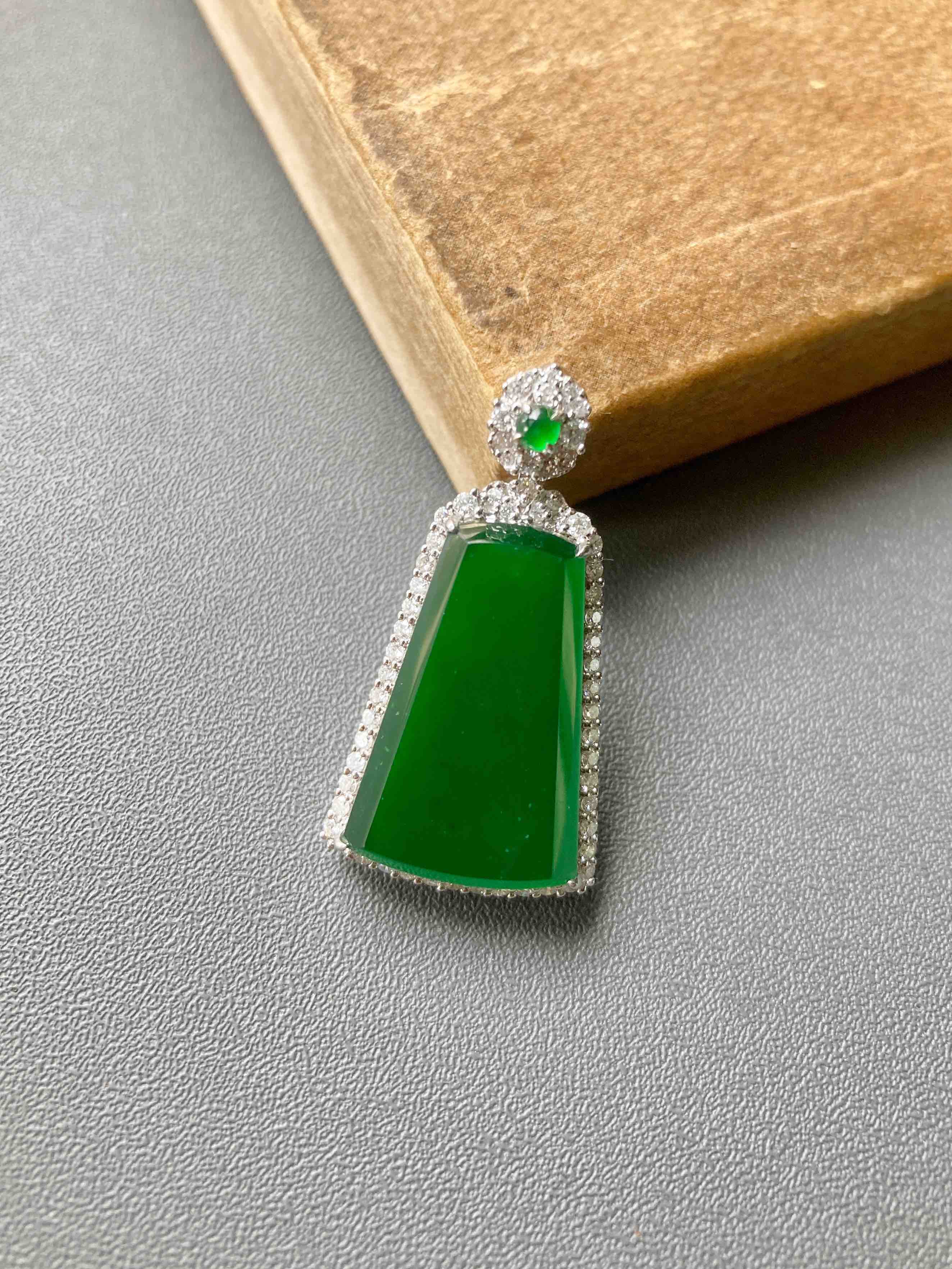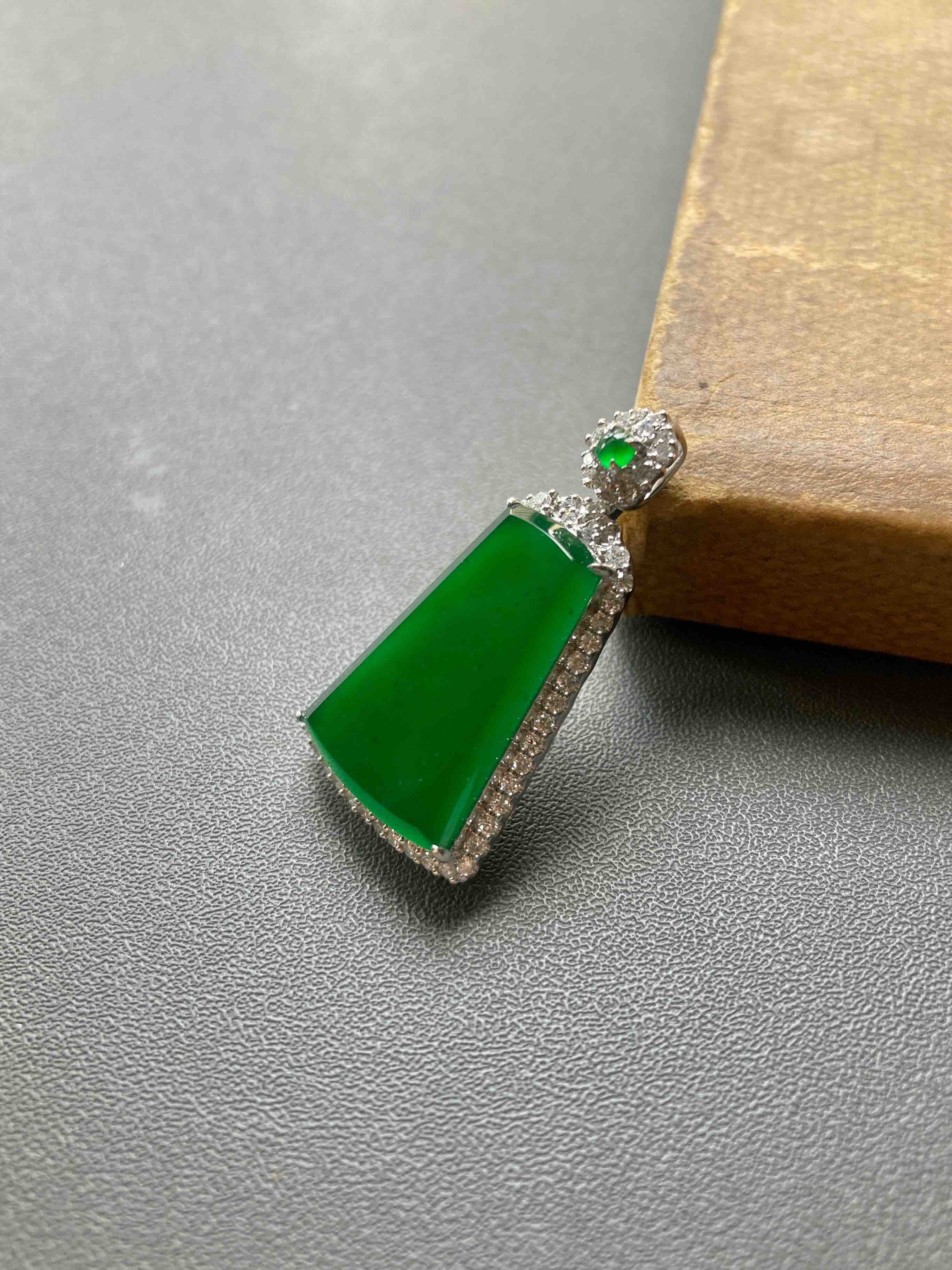 上次没抢到的今天赶紧,高冰种阳绿翡翠无事牌,色标级正阳绿,艳丽无比,实在太稀有,种水晶莹剔透,18k白金钻石镶嵌,后开盖,翡翠里的高档品类,保平安之物,无瑕疵的料子才能做光面无雕,一块这么大的阳绿平安无事牌,同料只做了两个,现在这是最后的机会,20.8×14×2mm,镶嵌后31×16.2×7.3mm