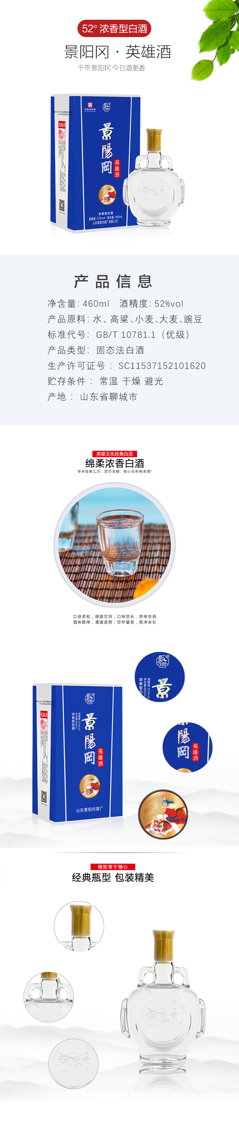 【下单即送本品1瓶】景阳冈 52度英雄酒浓香型粮食酒460ml*6瓶整箱装