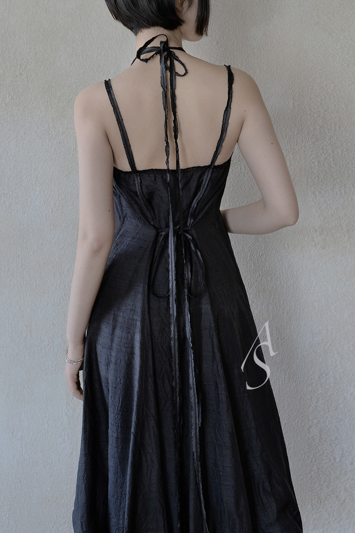 假两件的设计,其实是由螺旋斜裁而成的细长蚕丝面料拼缝在一起,贴合身量体形却不紧绷,衬托出纤细腰身。恰好的露肤度,日常穿着无负担。细吊带保留了初裁原始的毛边,呈现自然及自由的观感。面料是纬线走向肌理,阳光打在裙上,让整体黑色拥有了理性的光感分布。