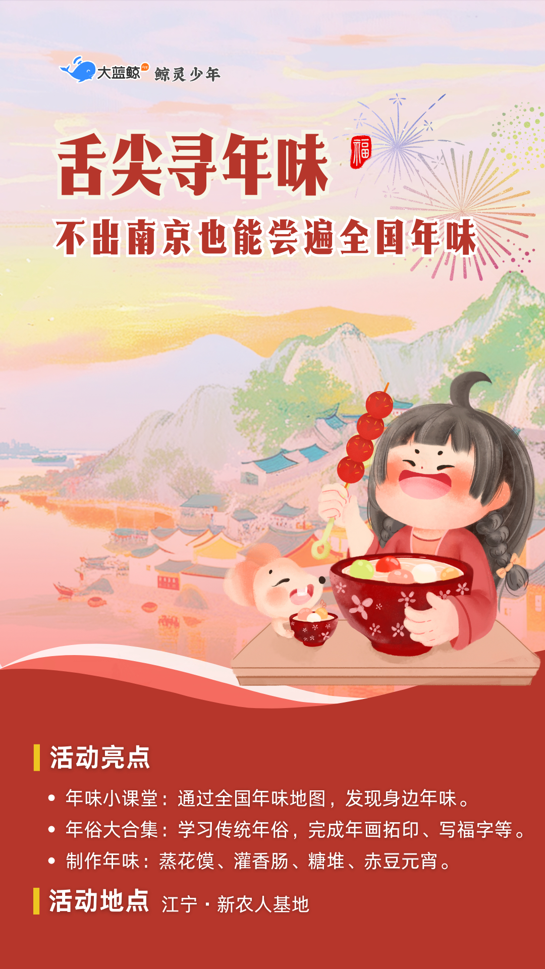 大蓝鲸爱研学|【亲子半日营】舌尖寻年味、蒸花馍、灌香肠、做糖堆儿、拓年画、写福字、吃赤豆元宵……不出南京,也能尝遍全国,用美食拼凑中国年!