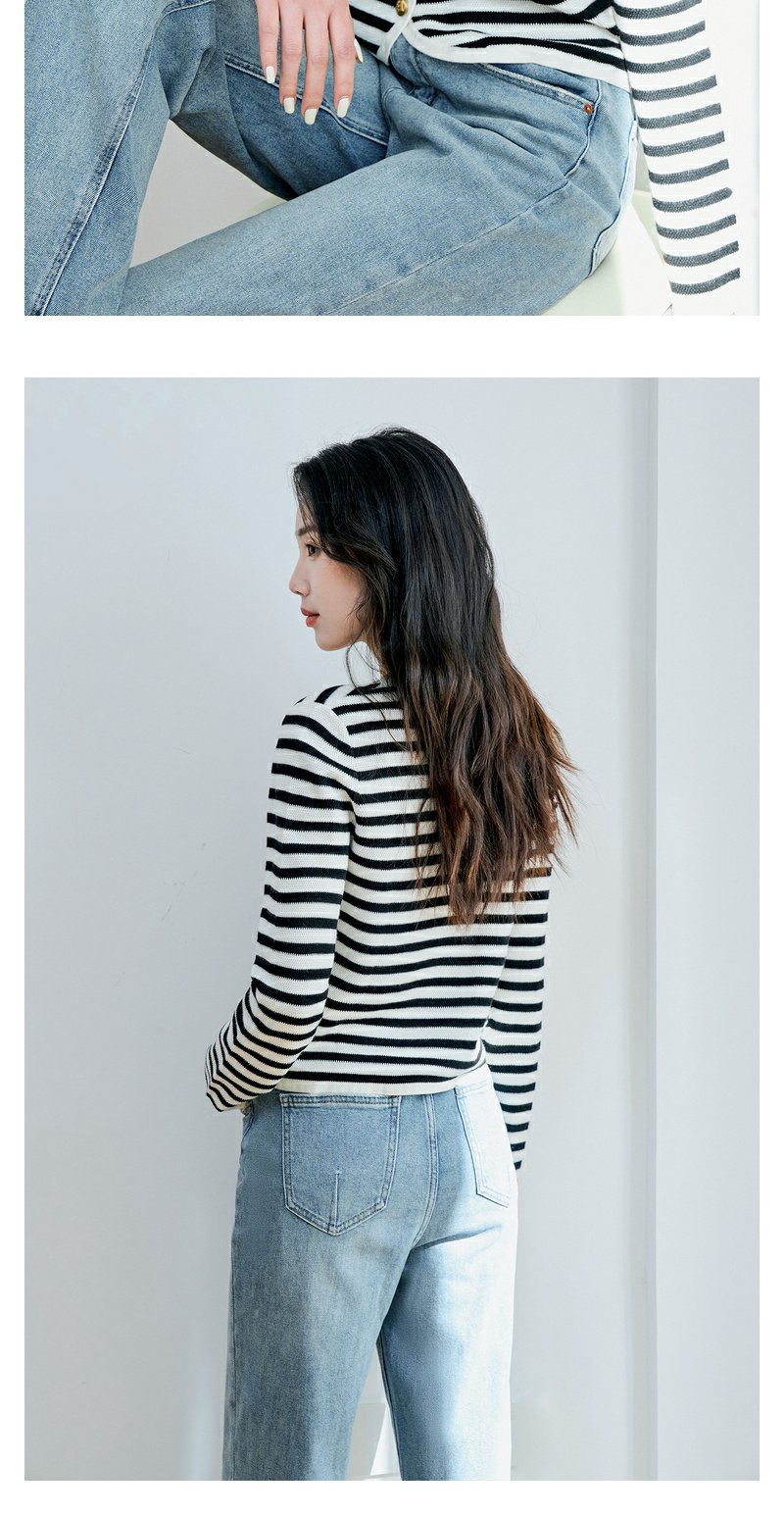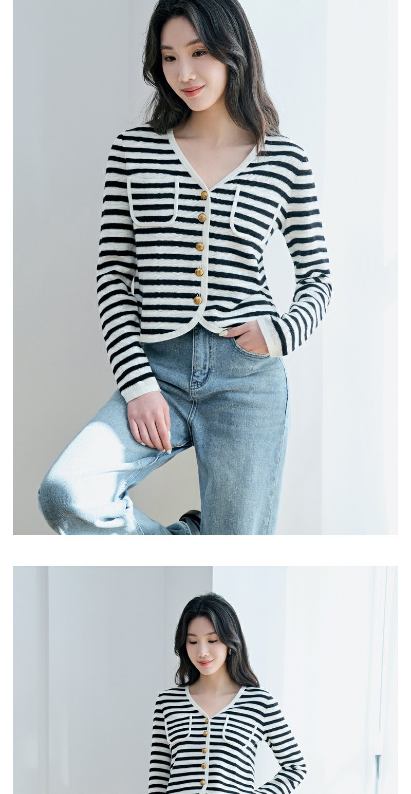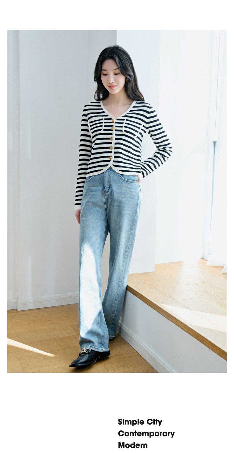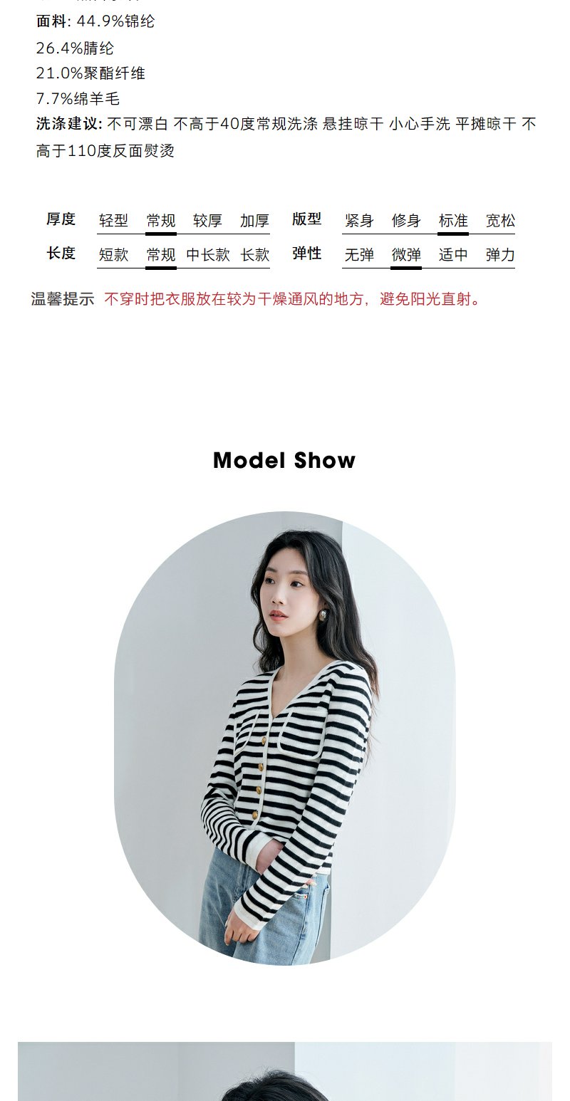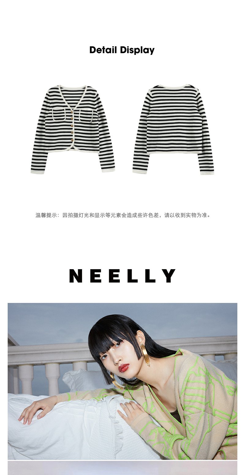 NEELLY纳俪商场同款V领条纹黑白撞色针织衫元气减龄百搭开衫上衣N23084A03307