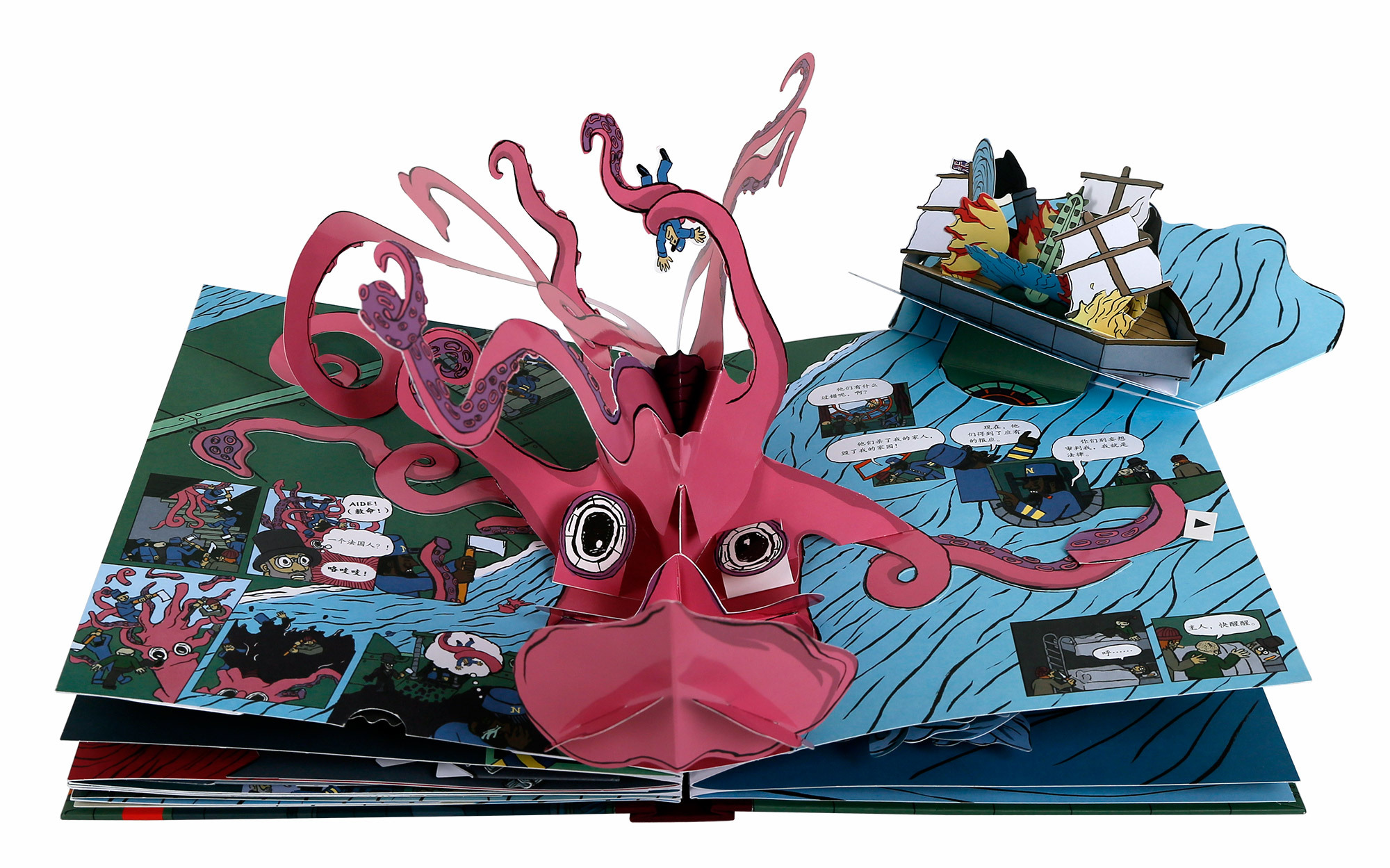 这套书的出现,必须感谢多才多艺的美国艺术家山姆·伊塔,他通过精心挑选并创作的八个场景,史前独角鲸的传说、鹦鹉螺号初现、教授及随从被抓进潜艇内部、沉入海底城市、踏上南极大陆、巨型章鱼、设法逃脱、脱离险境,将立体结构和漫画形式合二为一,给我们展现了一个独特的远洋航行和海底世界。