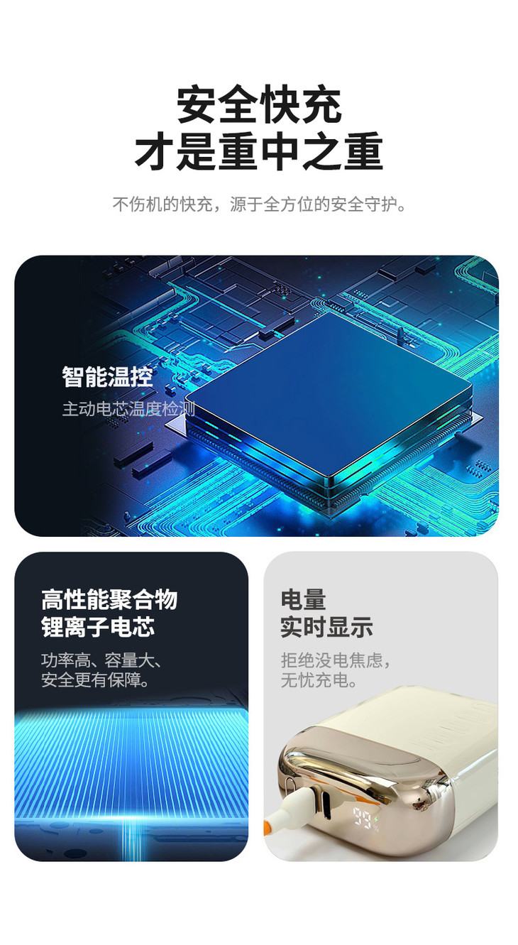 ✅顶级电芯+温控芯片,快充防爆,延长使用寿命