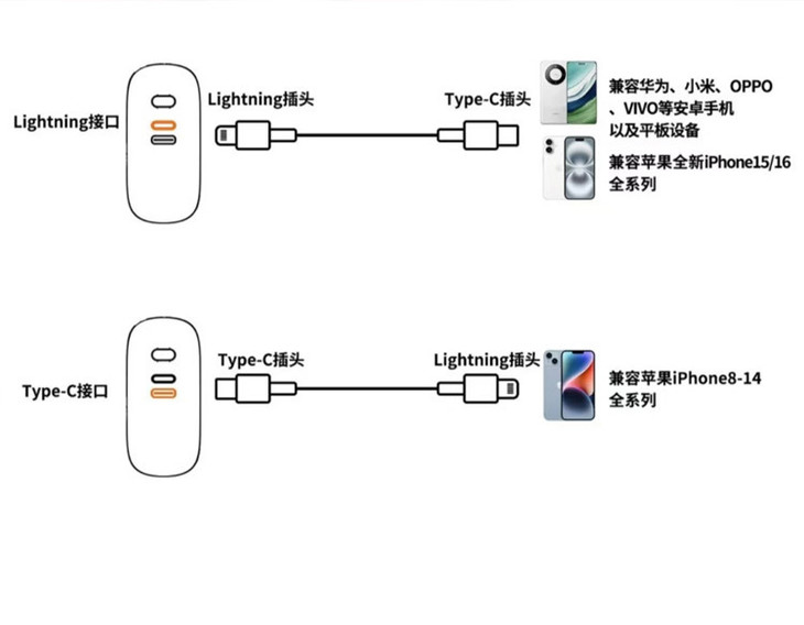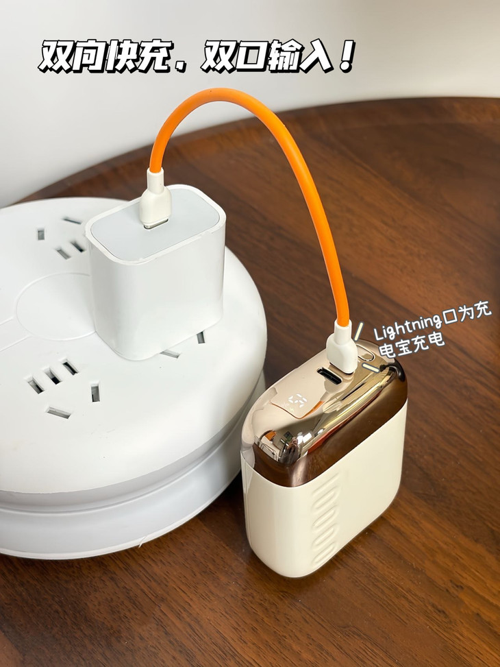 ✅拥有lightning/Type-C双充电口,双输入双输出,搭配外置双头快充线,支持苹果全系列PD快充和华为22.5W超级快充