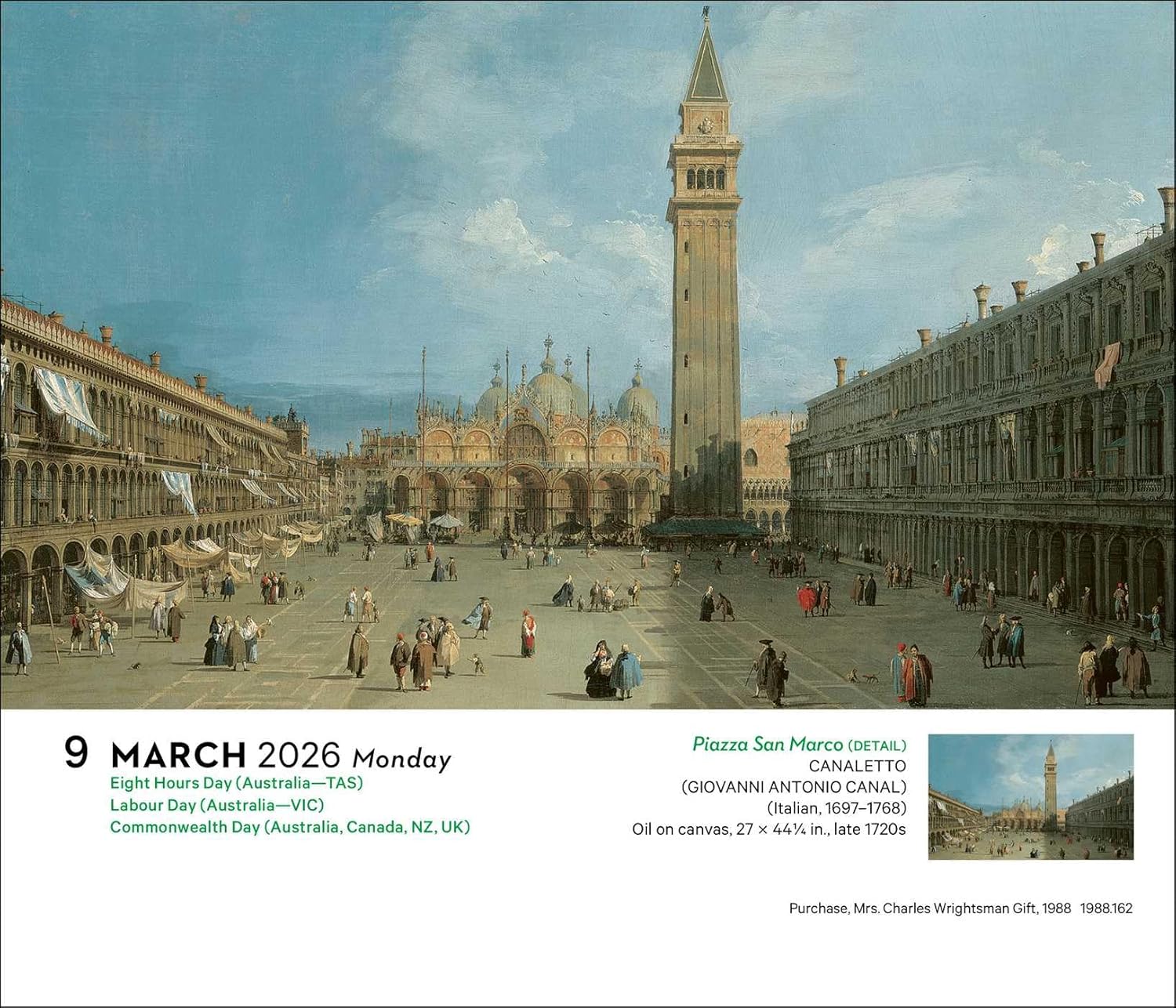 Visit The Metropolitan Museum of Art every day of the year with this engaging day-to-day calendar. At the beginning of each day, flip over the front sheet to reveal another glowing work of art. This calendar presents 313 vivid images embodying The Met’s vast collection of over 2 million works of art and 20 curatorial departments. Selections include exquisite paintings, drawings, sculptures, musical instruments, photography, arms and armor, decorative arts, jewelry, and costumes by such renowned artists as Vincent van Gogh, Claude Monet, William Morris, Louis Comfort Tiffany, Mary Cassatt, Georgia O’Keeffe, and Romare Bearden. Features include: Cover by Louis C. Tiffany (American, 1848-1933) and Agnes F. Northrop (American, 1857-1953) Page size: 7" x 6" Paper-over-board easel holder for desk or tabletop display Printed on FSC-certified paper with soy-based ink Full-color pages printed on both sides Day/Date reference on each page Combined weekend pages Official major world holidays and observances Moon phases, based on Universal Time Information about each work of art featured.