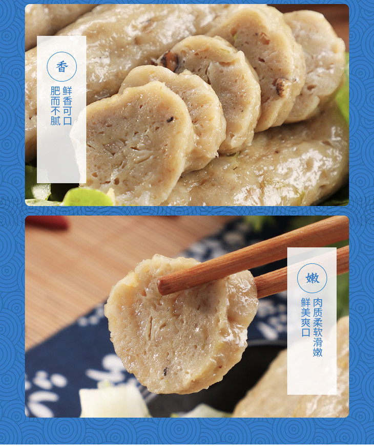 崇武鱼卷采用当地盛产的优质马鲛鱼,加入少量淀粉(一般为每斤鱼肉搭配二两淀粉)、猪肉和蛋清。
