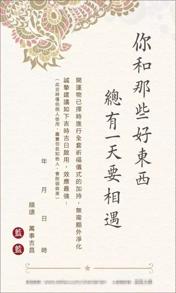 收到开运物后,可以试佩戴,但建议按照卡片上的说明,在我为你择取的吉时吉日里进行祈福许愿后佩戴,随着时间的推移,相关的好运就会逐步释放,才能得到更好的效应。