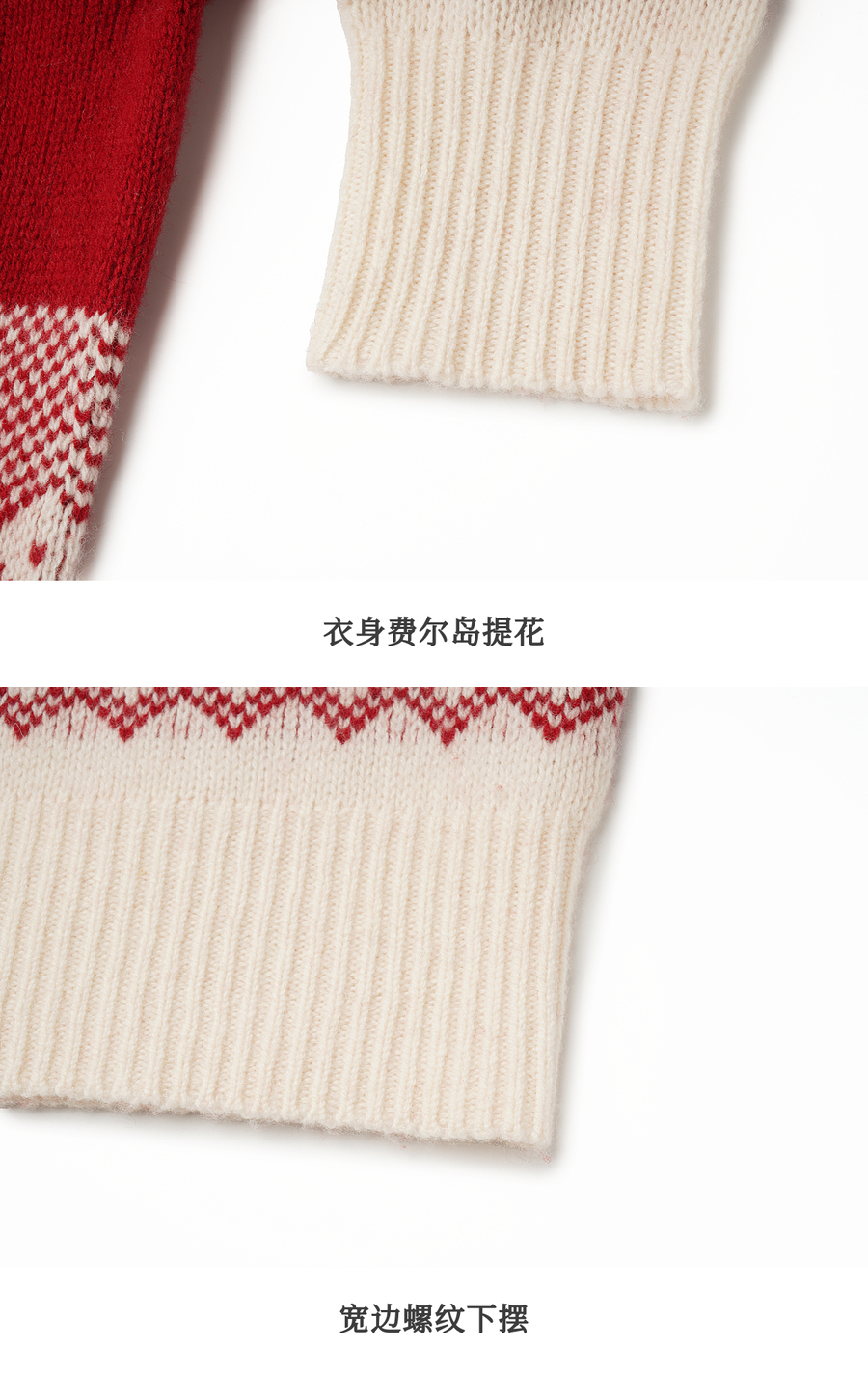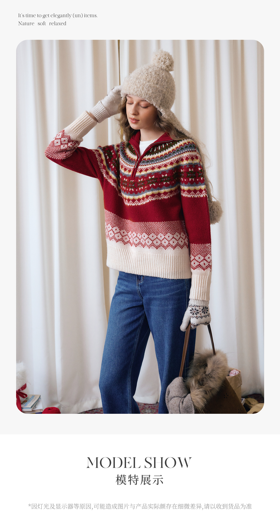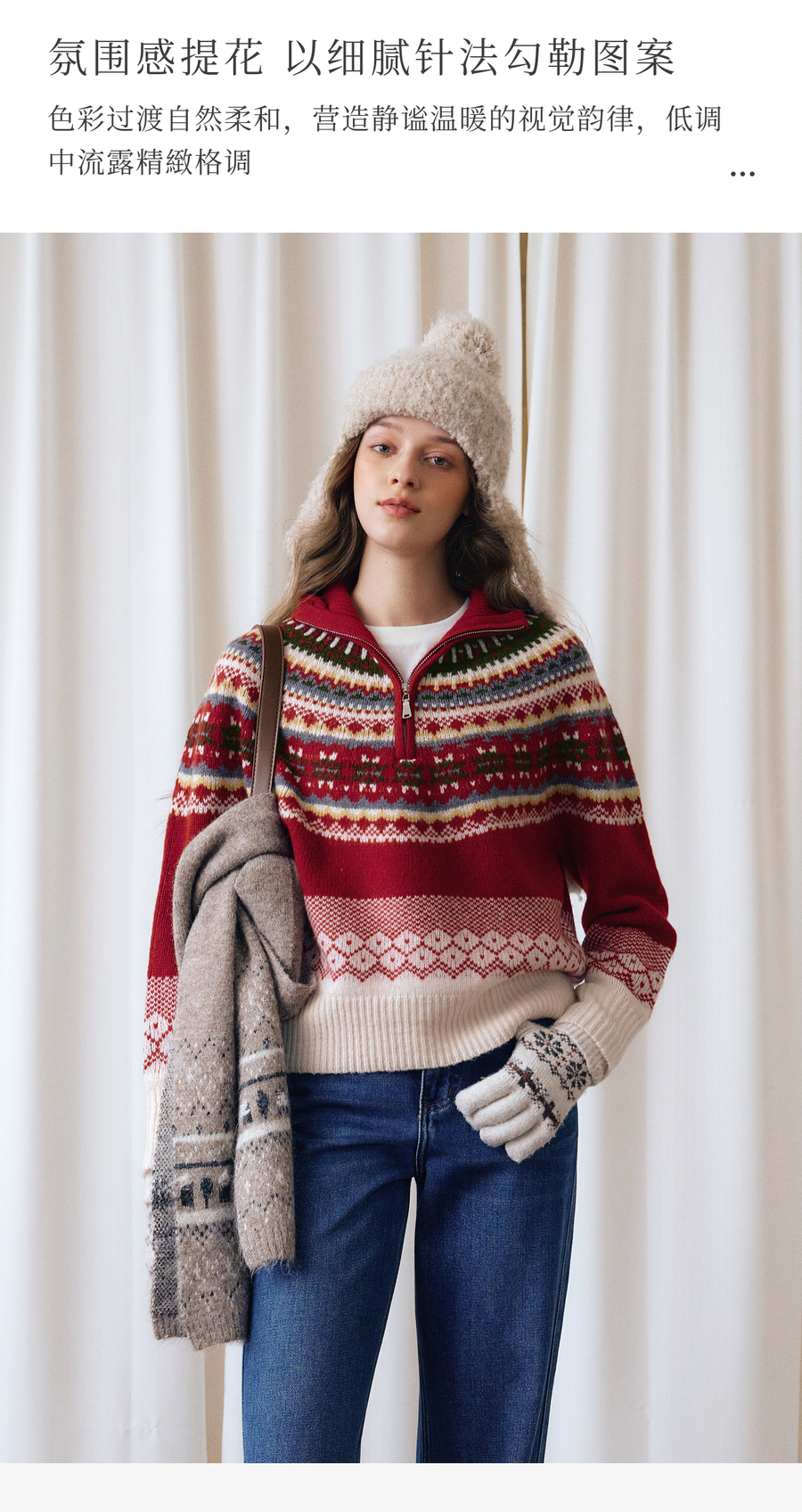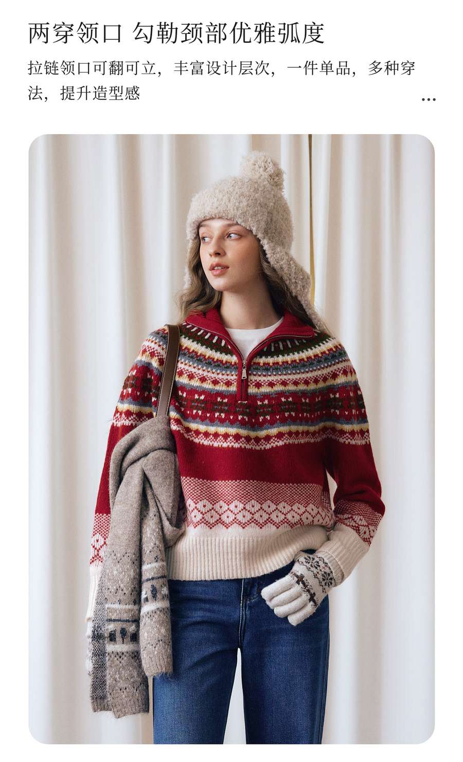 圣诞红色穿搭费尔岛提花纯羊毛针织衫女冬季新款半拉链套头毛衣