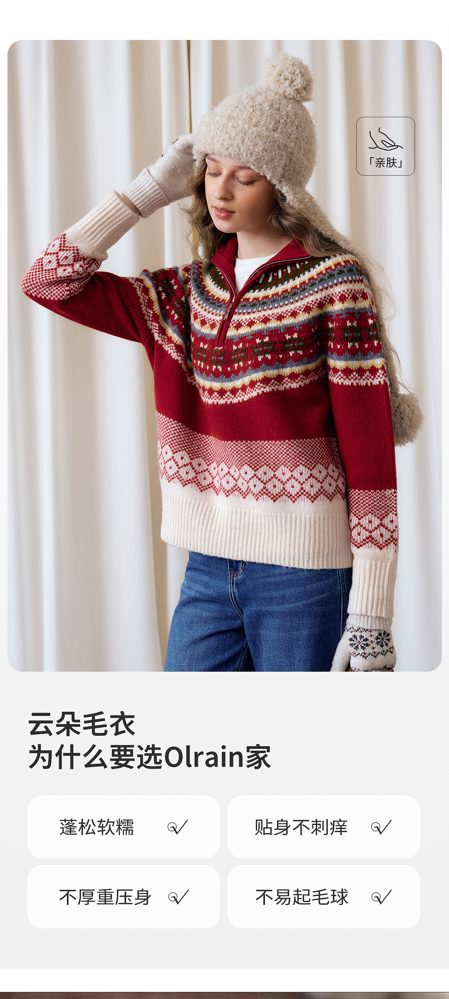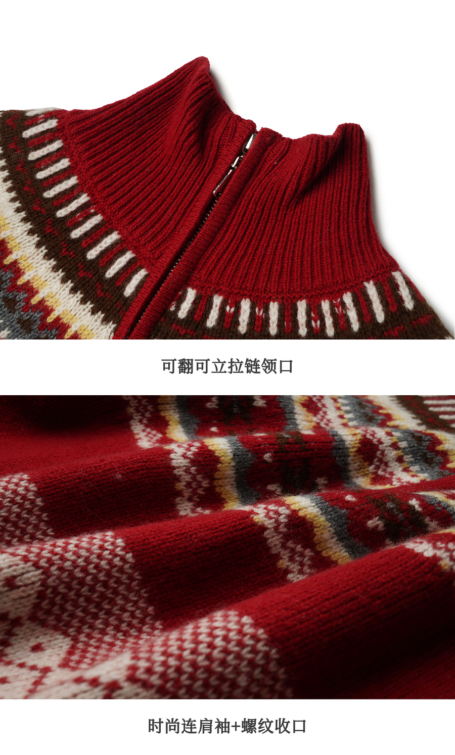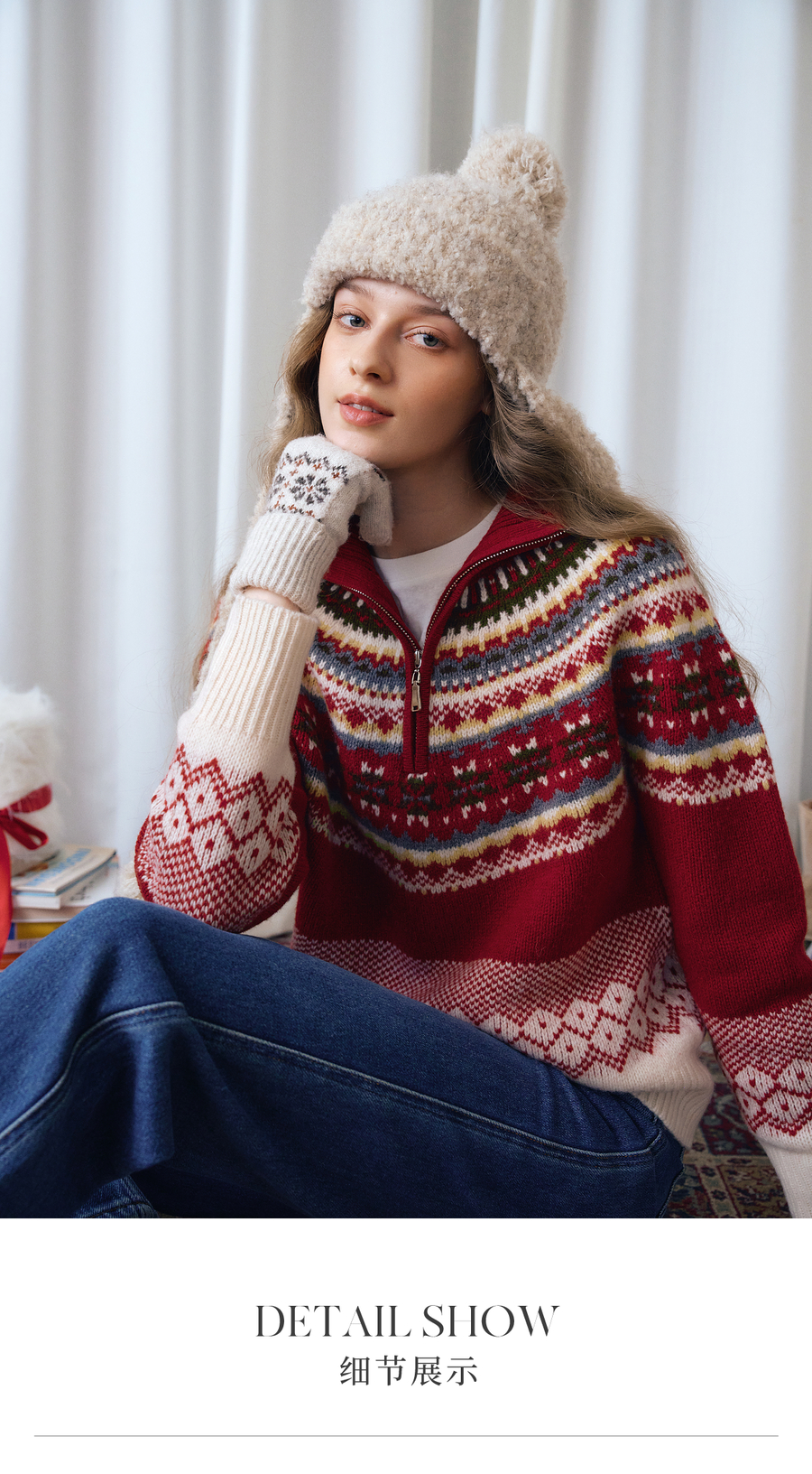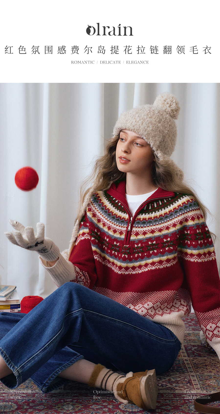圣诞红色穿搭费尔岛提花纯羊毛针织衫女冬季新款半拉链套头毛衣