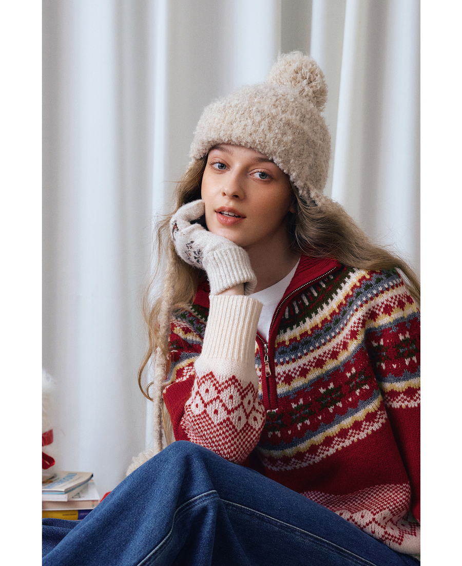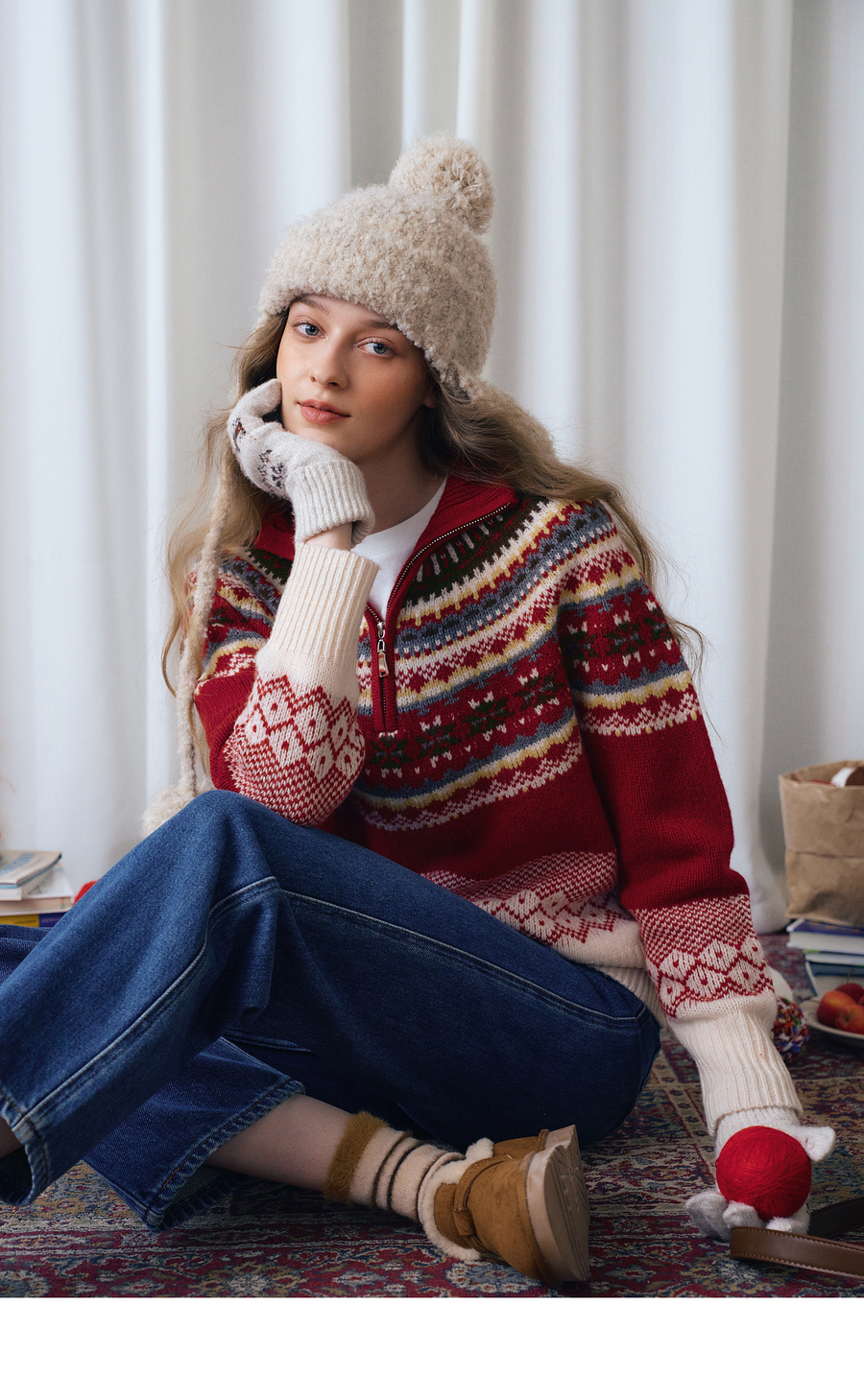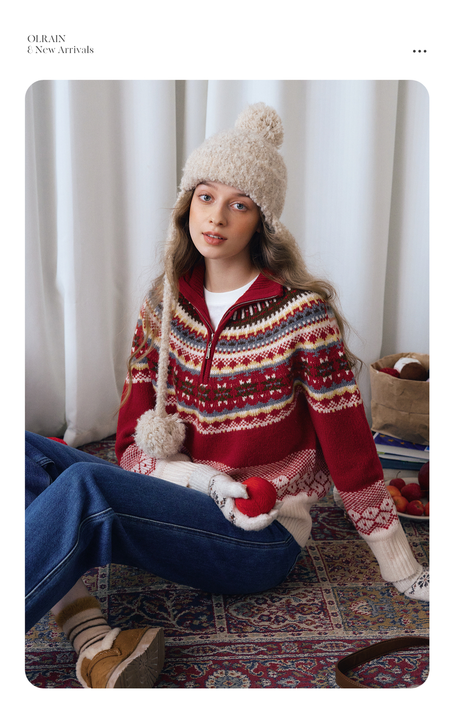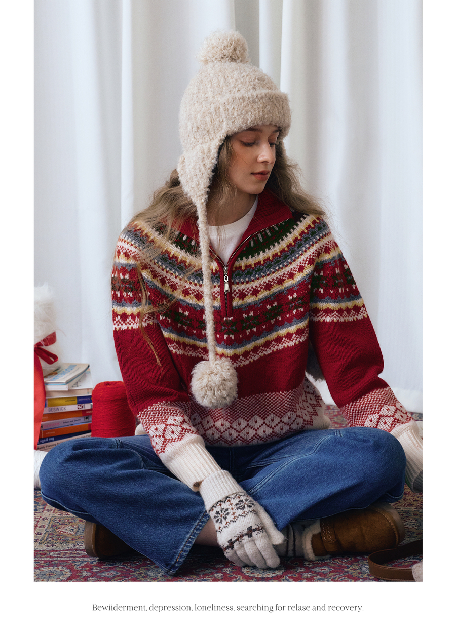圣诞红色穿搭费尔岛提花纯羊毛针织衫女冬季新款半拉链套头毛衣