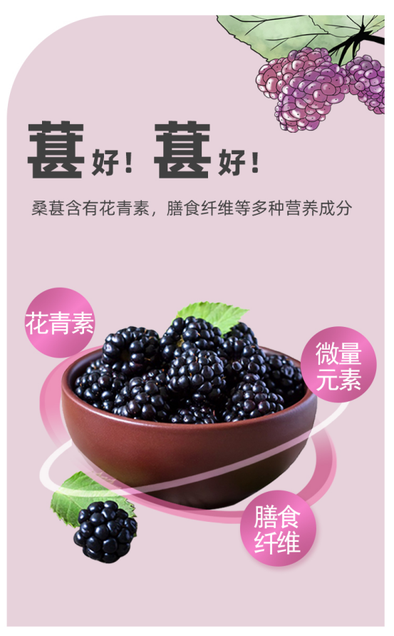 为什么想到在水牛奶里面加桑葚呢?桑葚有什么神奇的营养价值?让我们一起来搜一搜~ 桑葚,也叫桑果,早在两千多年前 桑葚已是中国皇帝御用的补品 因桑葚特殊的生长环境使桑果具有 天然生长,无任何污染的特点 所以桑葚又被称为“民间圣果” 它含有丰富的活性蛋白、维生素、氨基酸 胡萝卜素、矿物素等成分 这些物质具有良好的抗氧化作用 有助于抑制人体内的自由基 美女宝宝们都要看过来,这里能够抗衰老