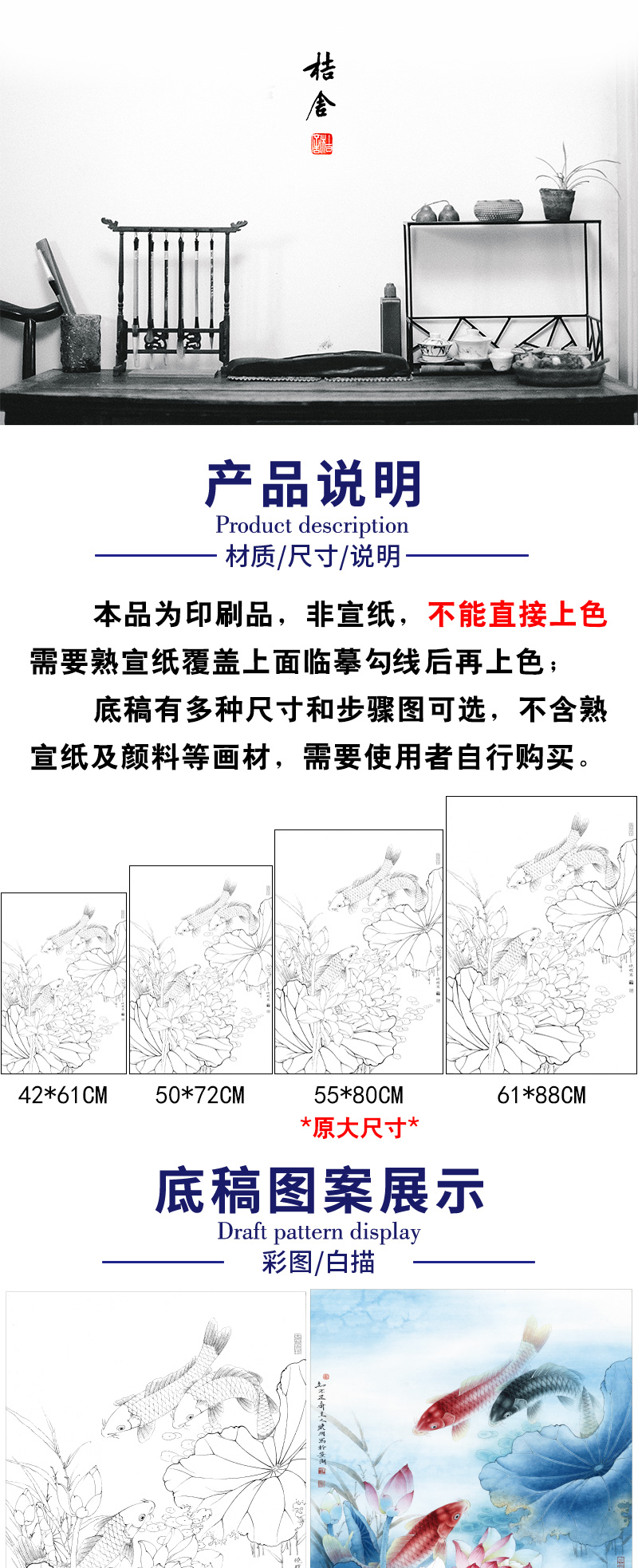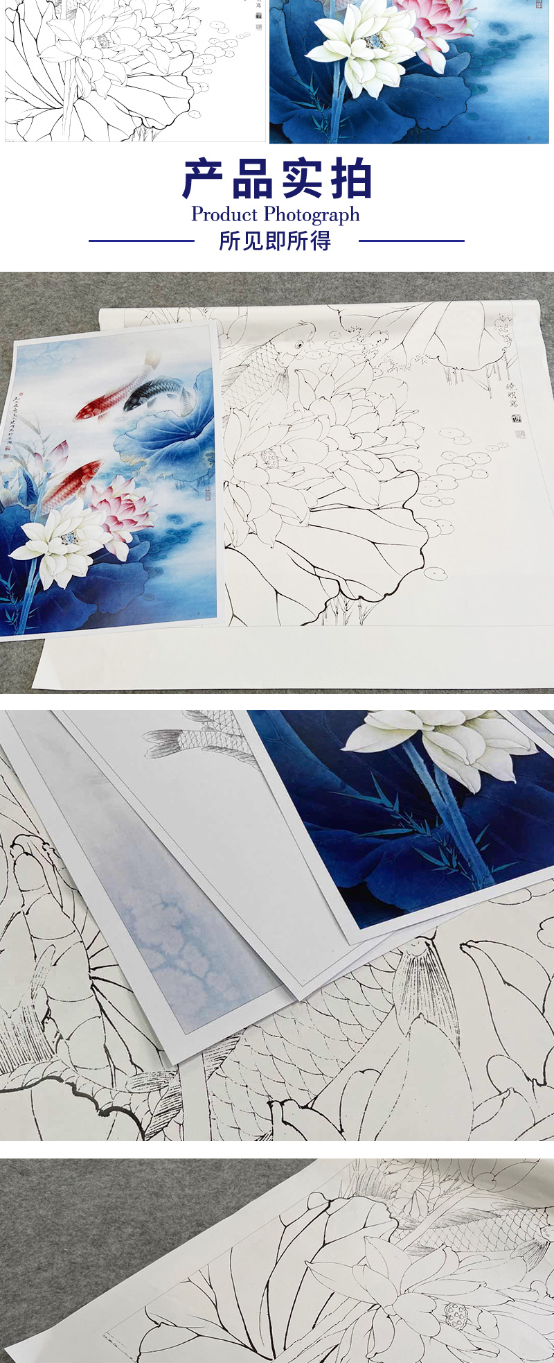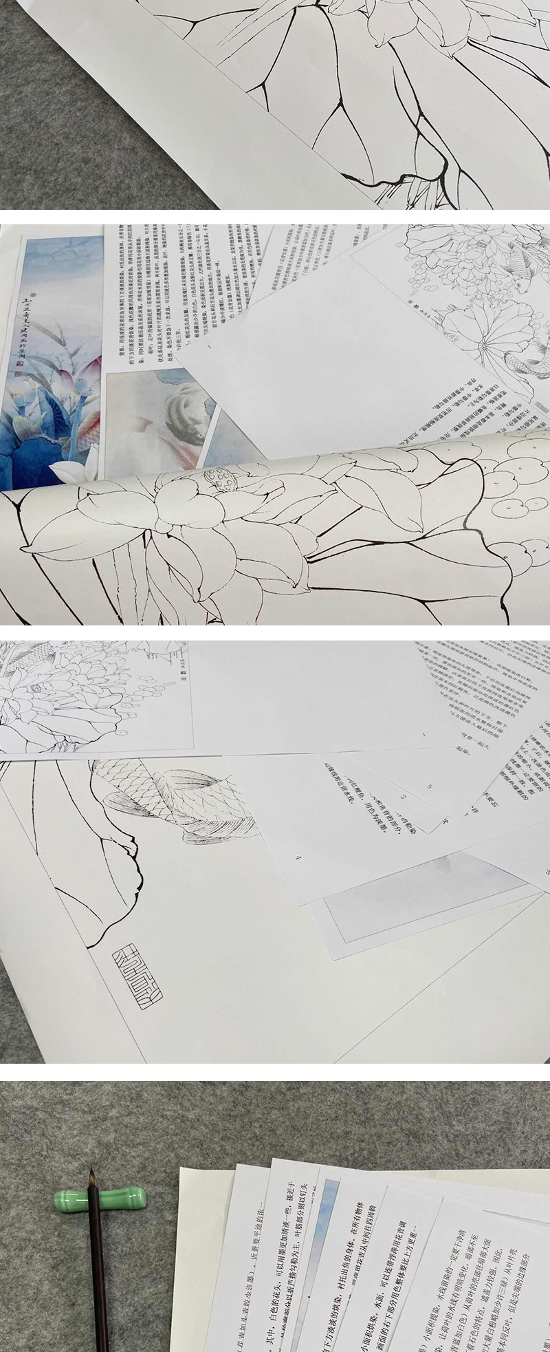 【有步骤、大彩图】李晓明工笔画白描稿斗方小品《连年有余图》荷花鲤鱼临摹勾线花鸟线稿KB21