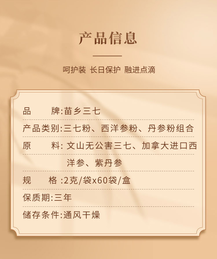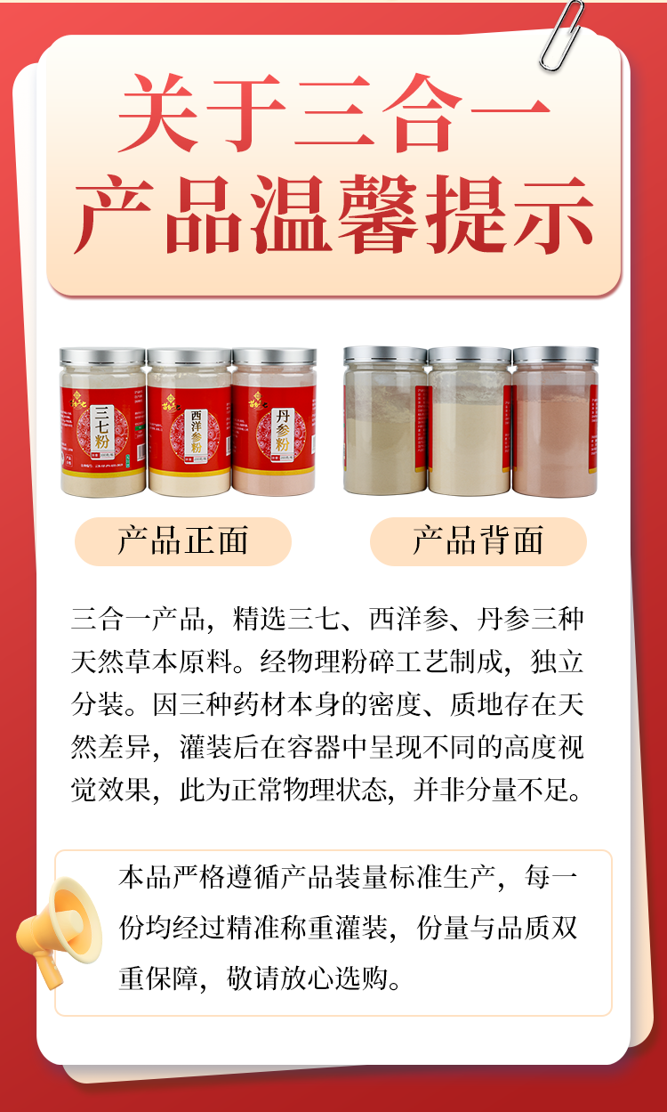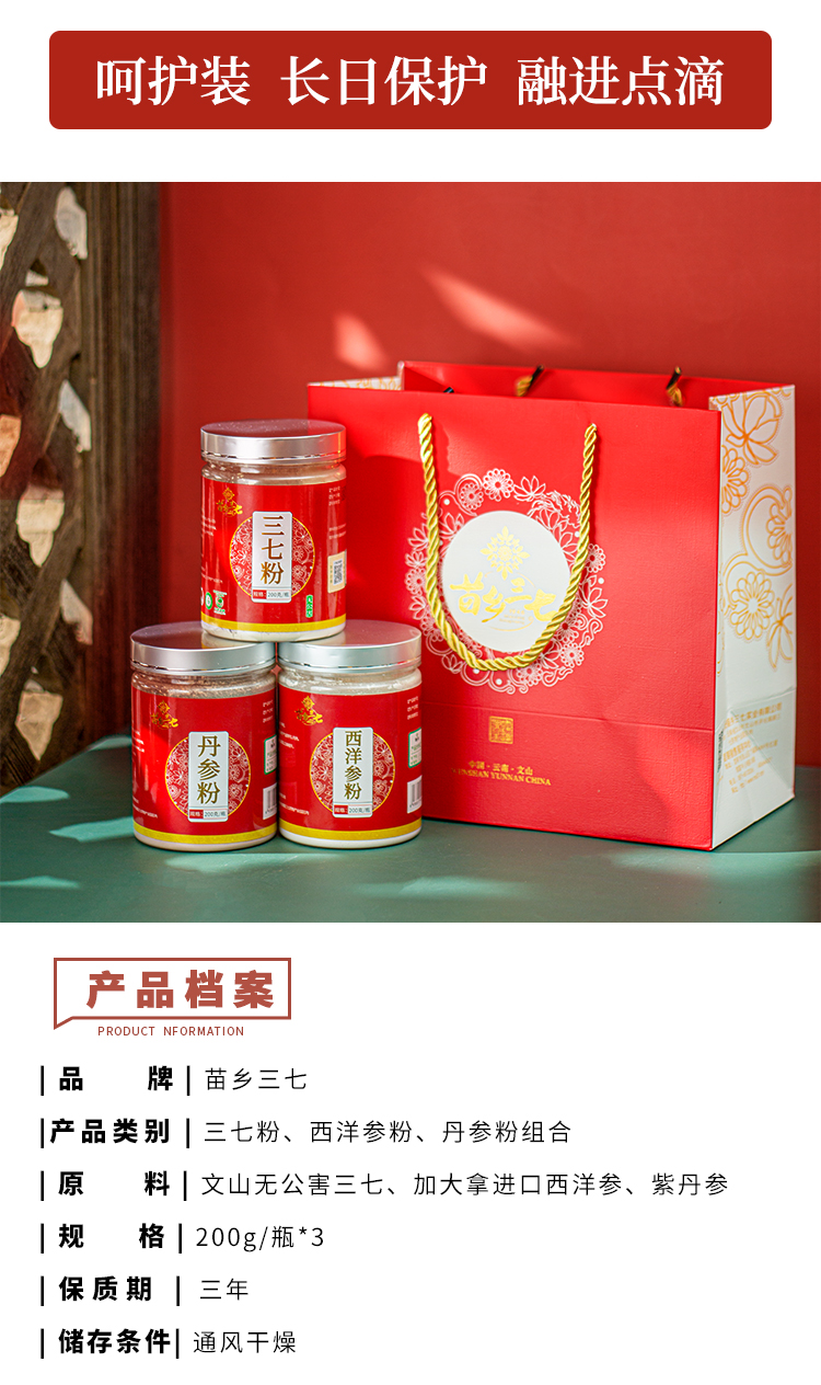 苗乡三七粉、西洋参粉、丹参粉三合一组合瓶装200克/瓶*3瓶 苗乡三七粉、西洋参粉、丹参粉三合一组合便携装2克/袋*60袋/盒*3盒 2种规格