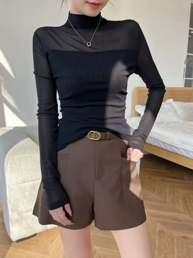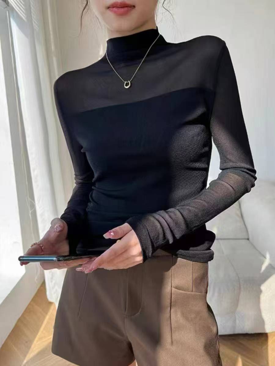 伯妮斯茵 | 轻熟气质风 | 半高领网纱打底衫 | 微透拼接设计 | 修身显瘦版型 | 通勤叠穿|SZ3T55