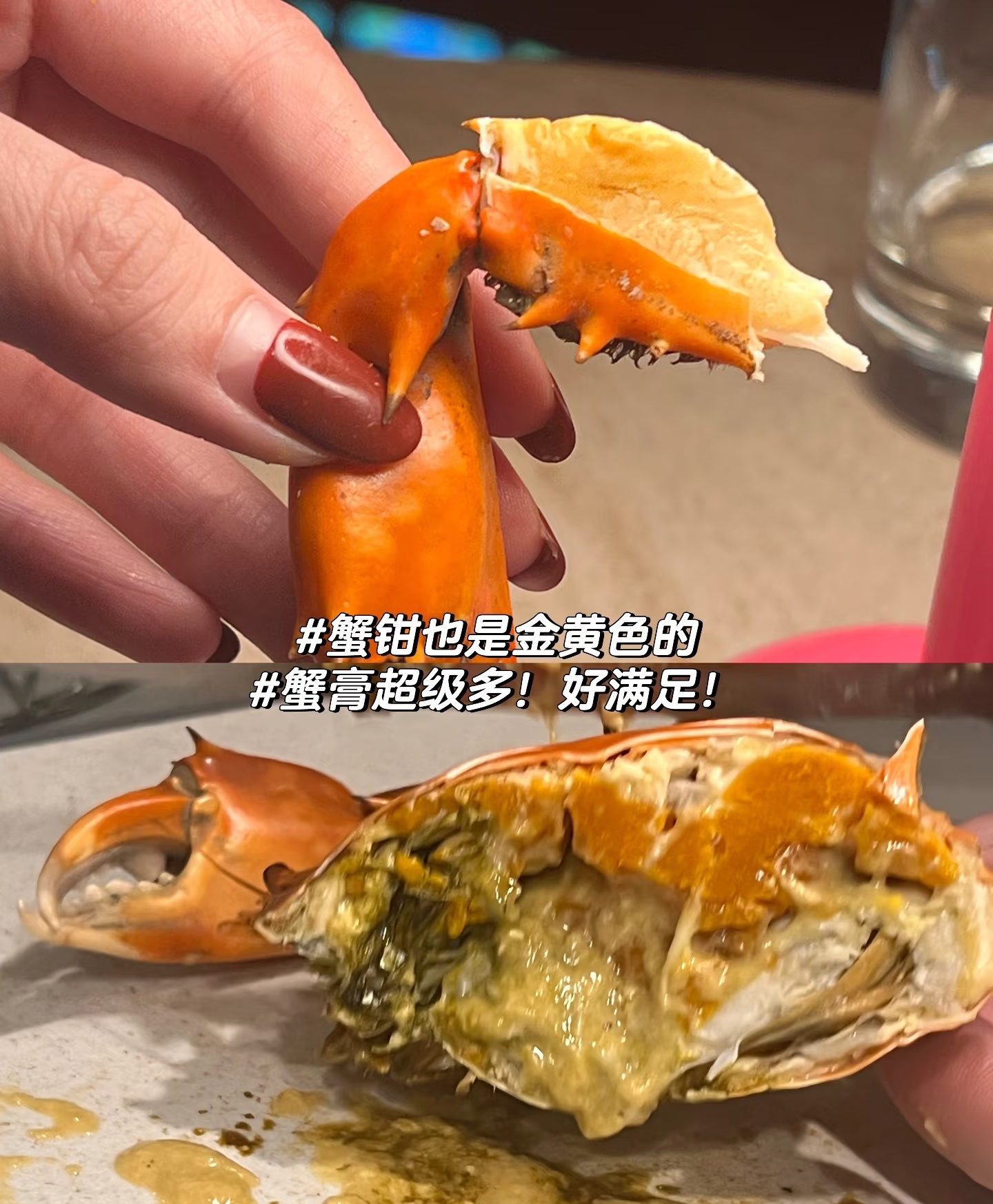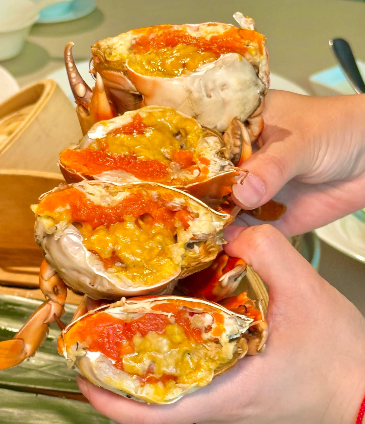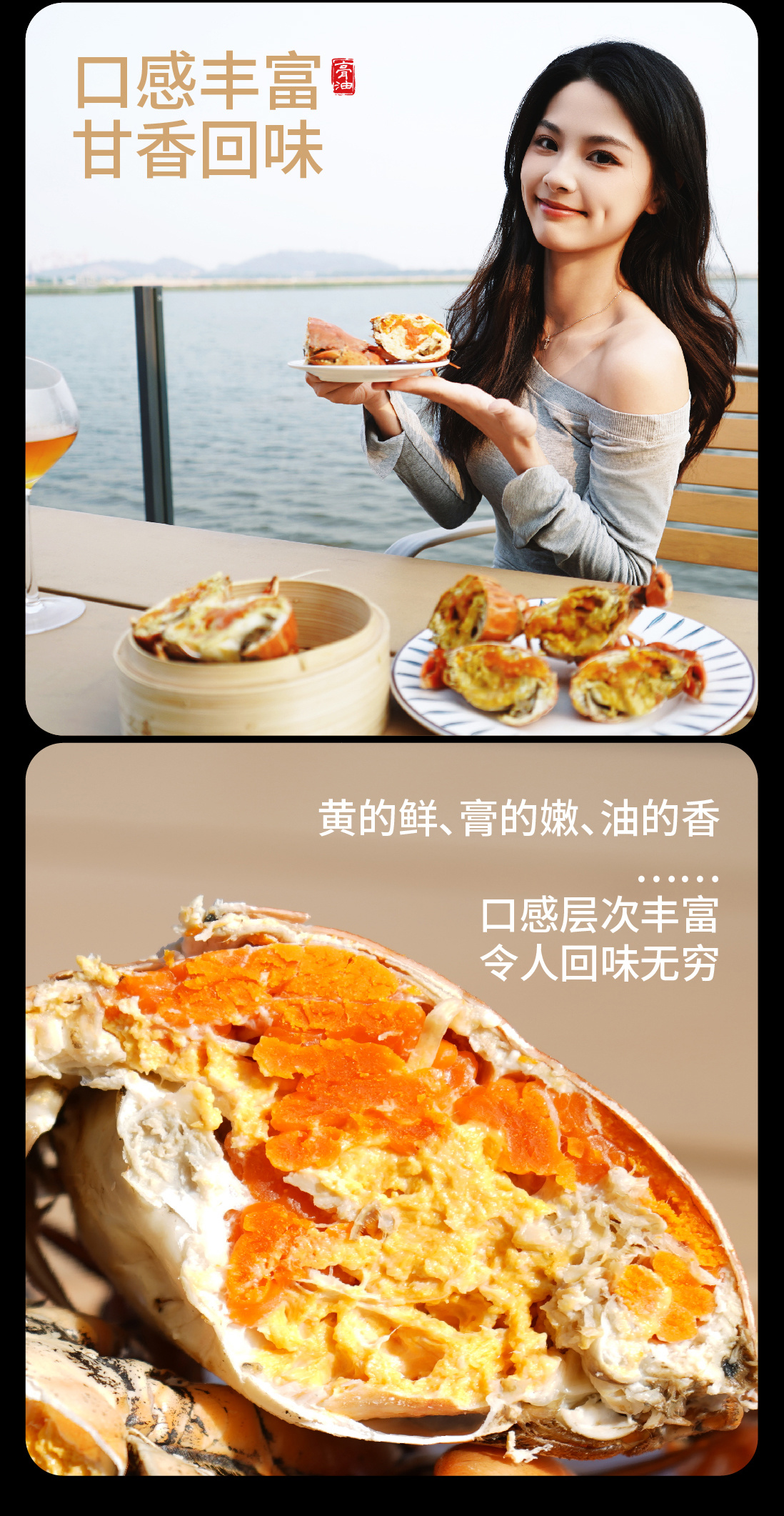 膏满油滑,入口即化,蟹膏丰富,油脂饱满,口感滑嫩。鲜甜交融,既有蟹肉的鲜嫩,又有蟹膏的醇厚,让人一试难忘。