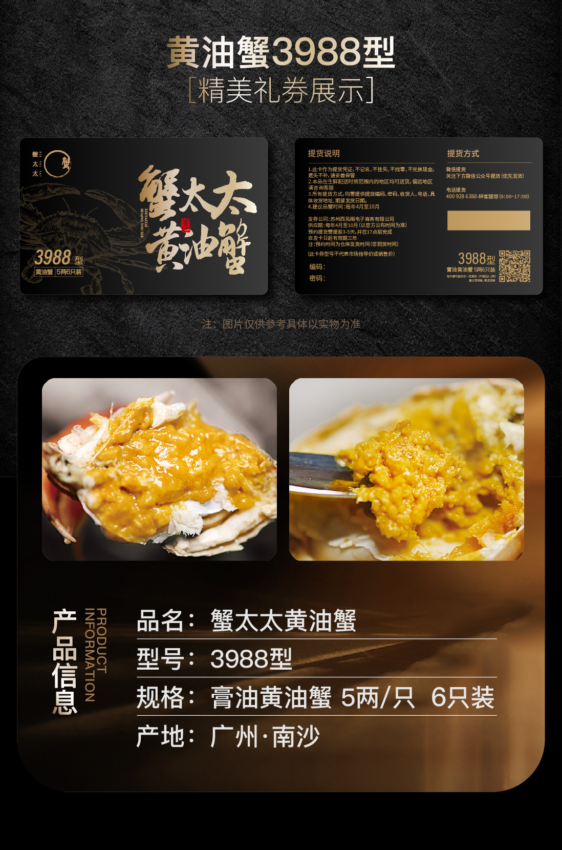 🌟6两规格:大只又霸气,送人超有排面!蟹肉厚实,膏油满满,蟹盖一打开,金黄的膏油都要溢出来。5288型,品质上乘,无论是商务宴请还是送重要的人,都倍儿有面子 。