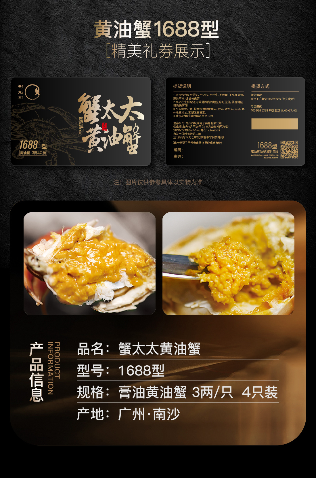 🌟4两规格:大小适中,蟹肉与膏油的量恰到好处。不管是自己吃,还是和朋友分享,都很合适。3388型是这个规格的经典代表,口感丰富,每一口都让人陶醉 。