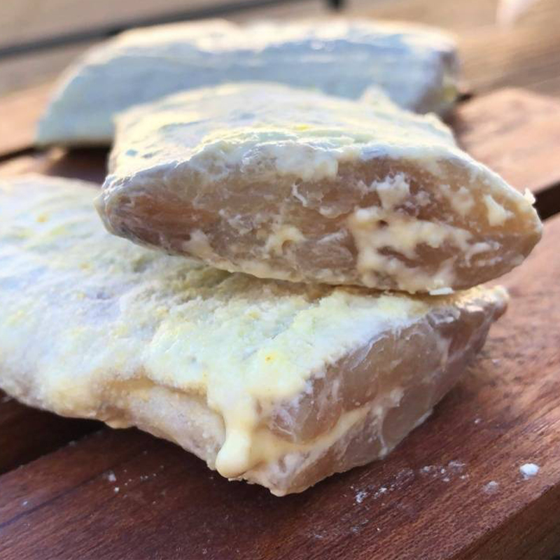 加了盐和味素调味,裹了干淀粉,回家直接香煎或油炸即可!