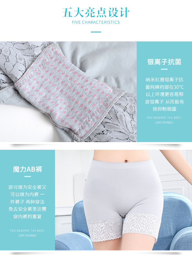 P.S. 这款安全裤的底档都是纳米银离子小红唇抗菌的。纳米银离子裆部会随着温度变化,最近天气太热,快递中转过程中的车厢内温度更高,收到产品后,在空调房内静止一个小时,或者用冷水冲一下,红色唇印,就恢复如初了。