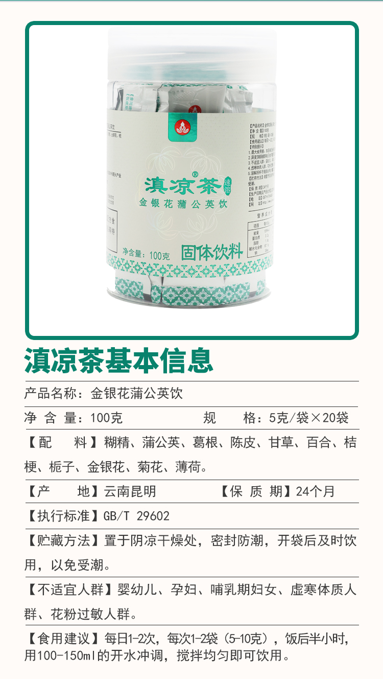 滇凉茶生津清凉金银花菊花去火茶蒲公英夏枯草本浓缩速溶吸收好(5g*20袋/瓶×1瓶)