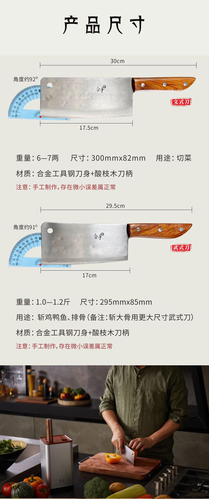 【温馨提示】刀具通过手工锻打生产,为保证锋利度含碳量也就相对较高,虽然使用的合金工具钢中已经含有防锈防腐蚀的金属元素,但是在加工生产过程中为了保证健康,没有浸泡防锈液等化学药品,让刀具表面形成防锈层,所以还是会出现生锈情况的。