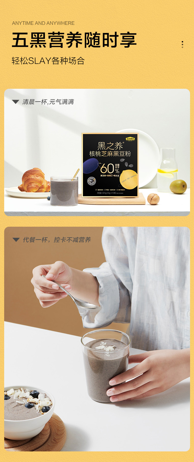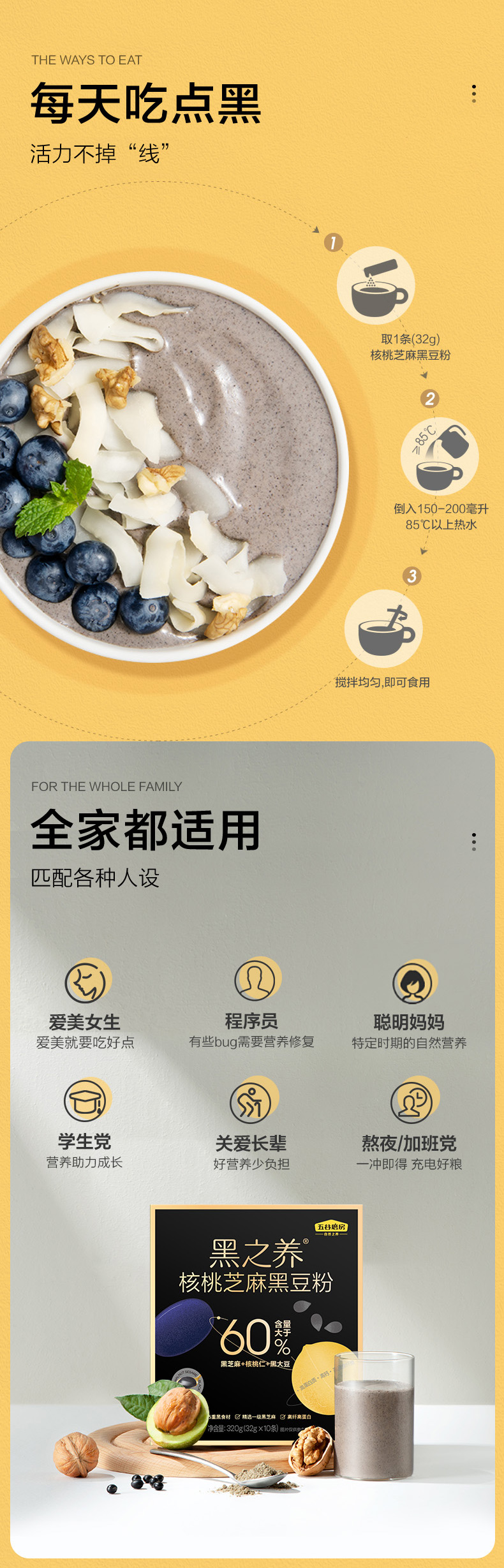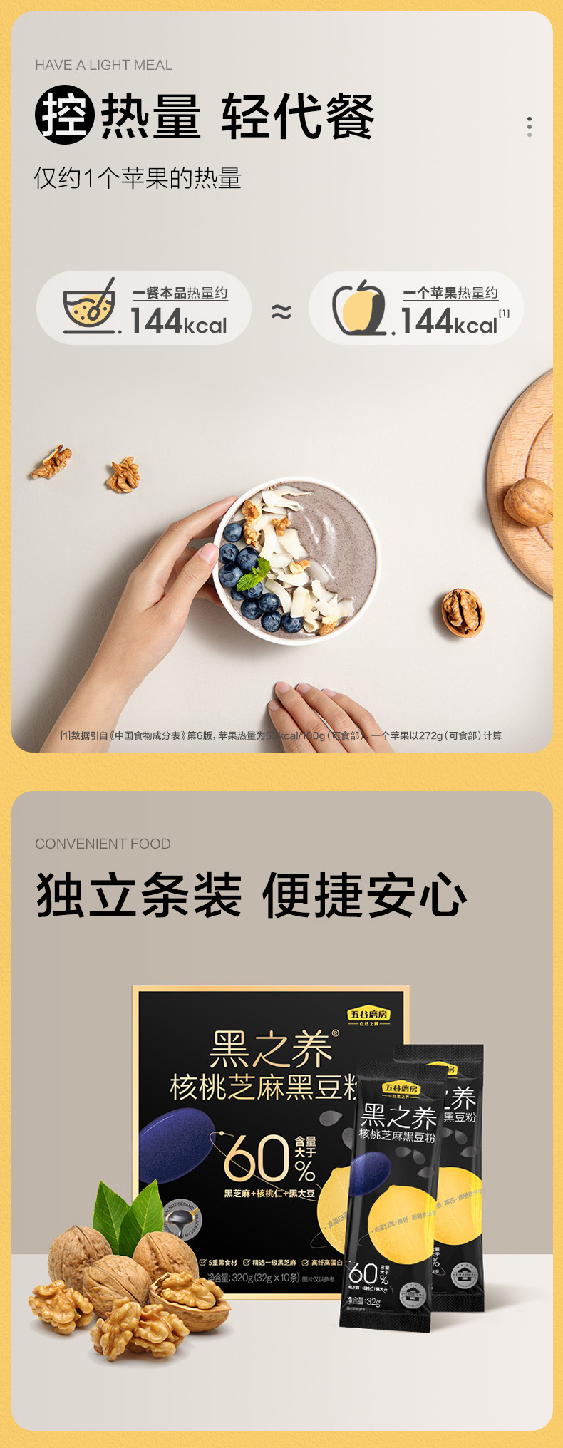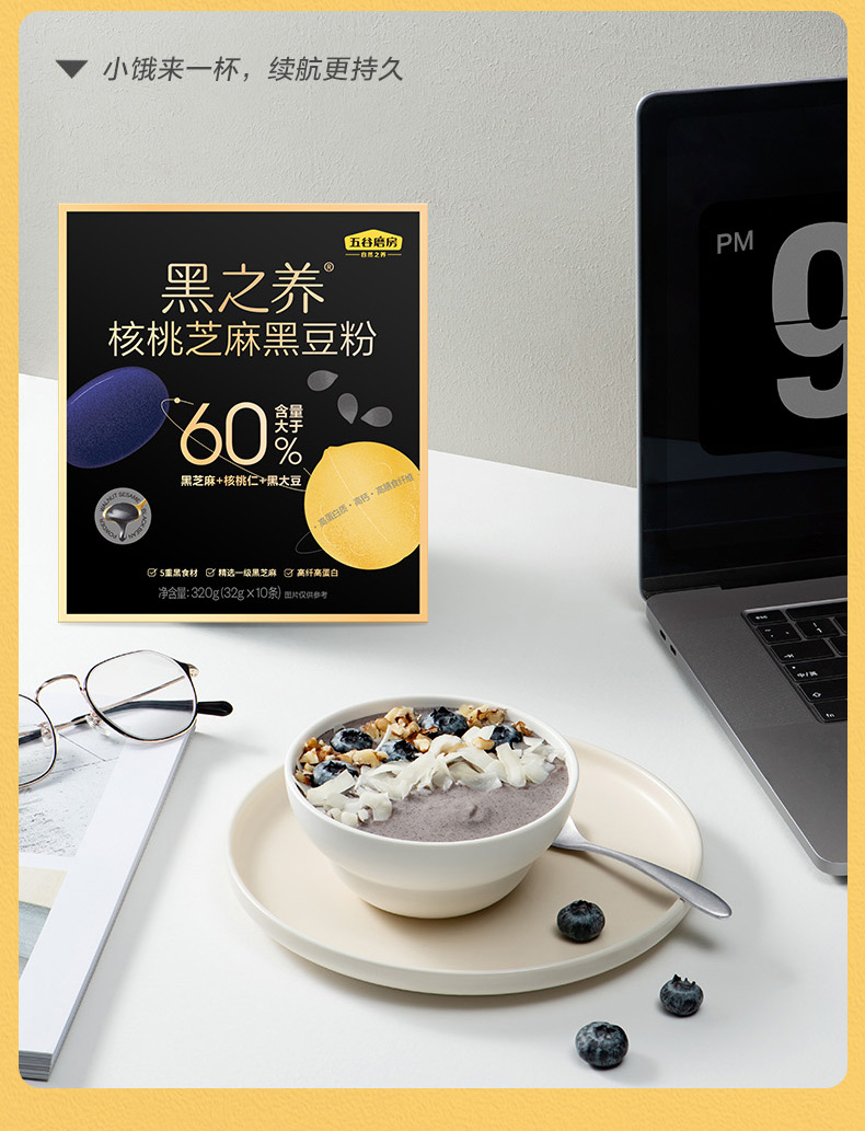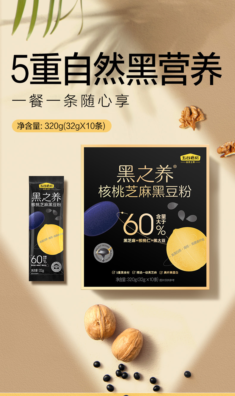 【自营】五谷磨房 黑之养核桃芝麻黑豆粉黑芝麻糊黑米杂粮饱腹代餐营养早餐320g(32g*10)