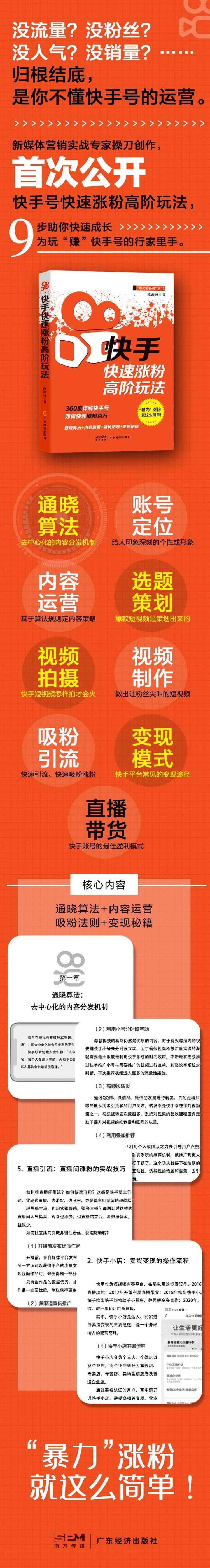 本书致力于深挖快手的玩法,定位在进阶技巧,结合全新、极具代表性的案例,从通晓算法、账号定位、内容运营、选题策划、视频拍摄、视频制作、吸粉引流、变现模式、直播带货等方面,挖掘快手涨粉、运营、变现的新玩法。本书特别适合对快手有一定了解,但希望进一步学习快手新玩法的读者朋友阅读。