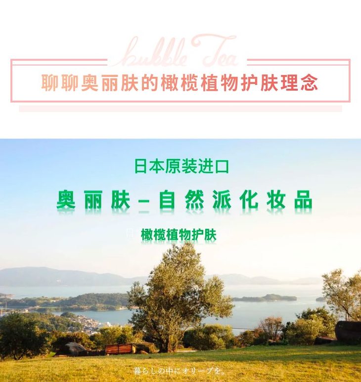 奥丽肤的橄榄园产地及工厂位于冈山县(被誉为“日本的爱琴海”),自然风景优美,气候温暖,日照时间长,拥有“晴天wang国”之美誉,而牛窗町因位于濑户内海,适合橄榄树的生长。