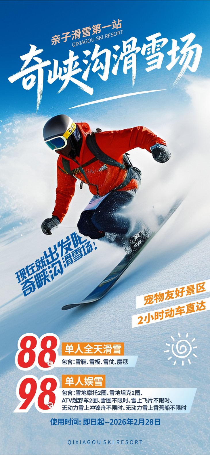下单立减8元!即买即用,松潘奇峡沟玩雪季,全天滑雪套餐、娱雪套餐,雪地摩托,雪地坦克,越野车,冲锋舟+雪上香蕉船不限时畅玩。