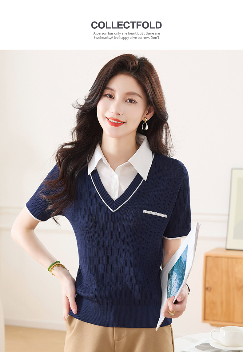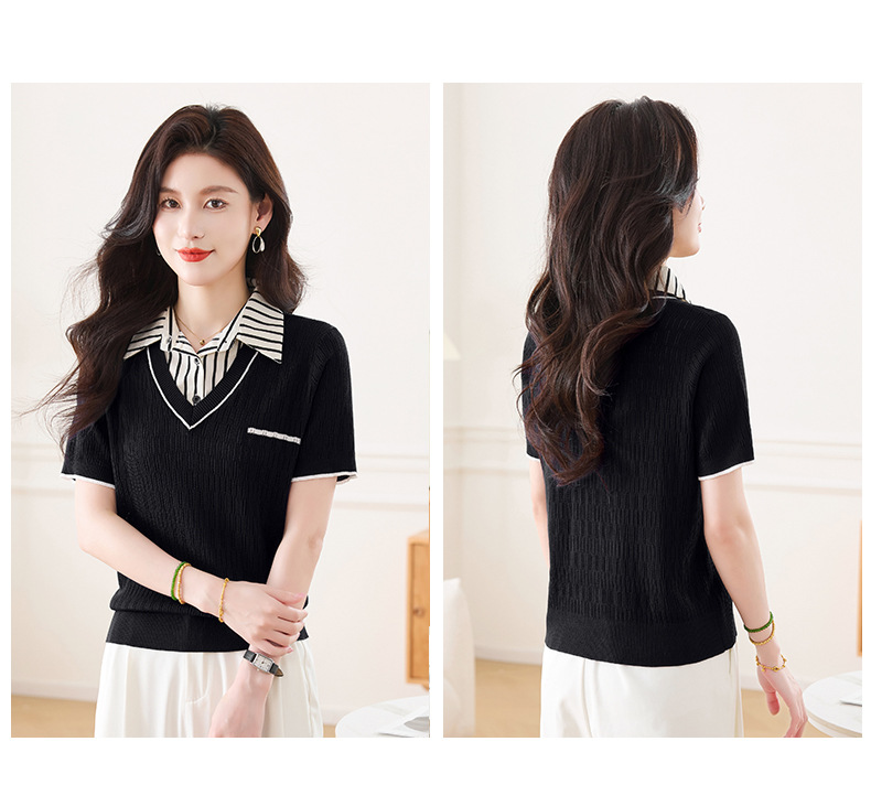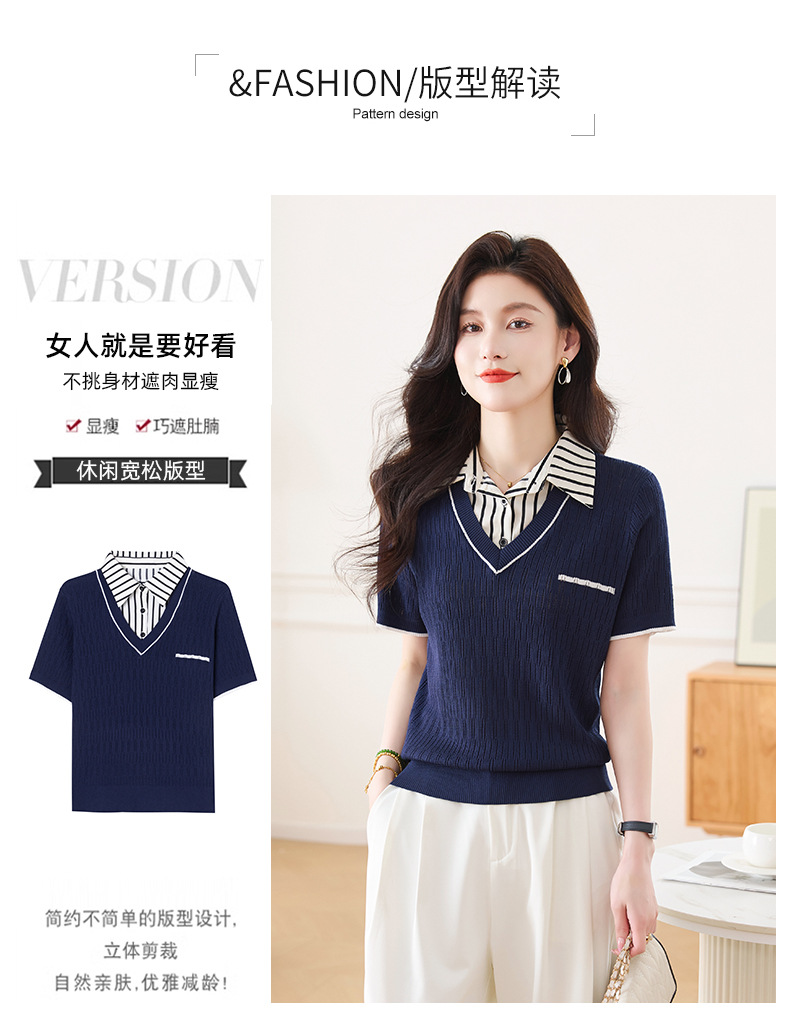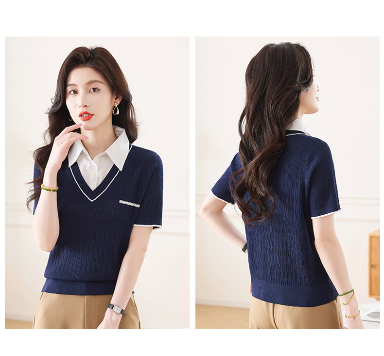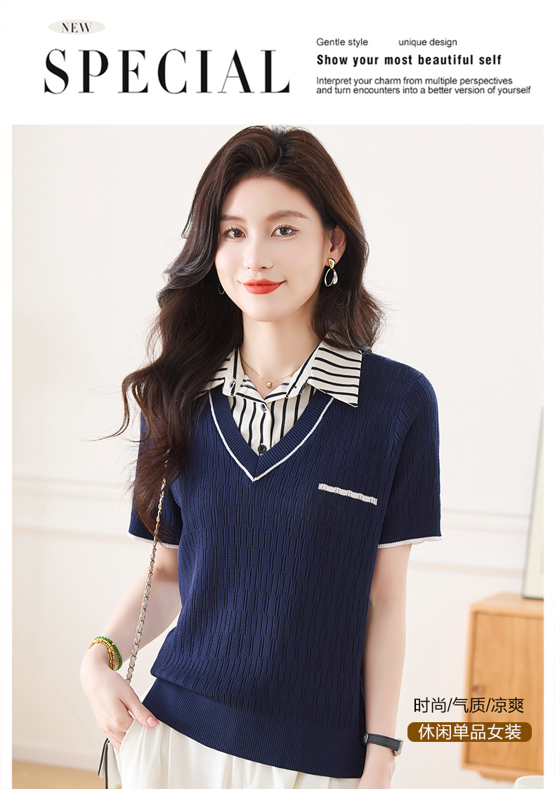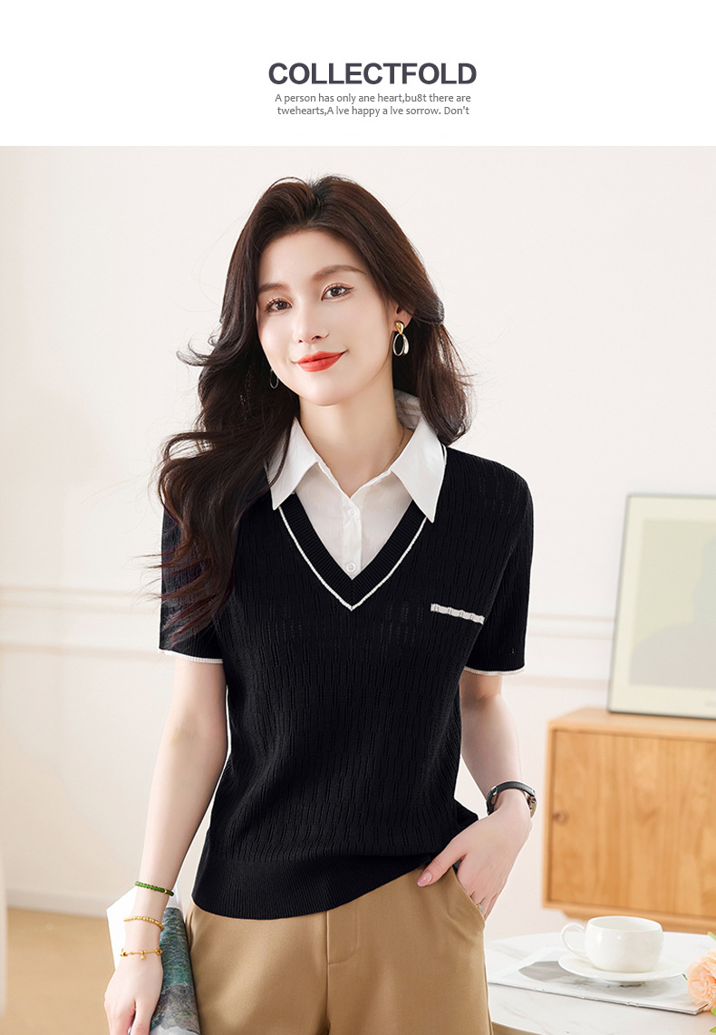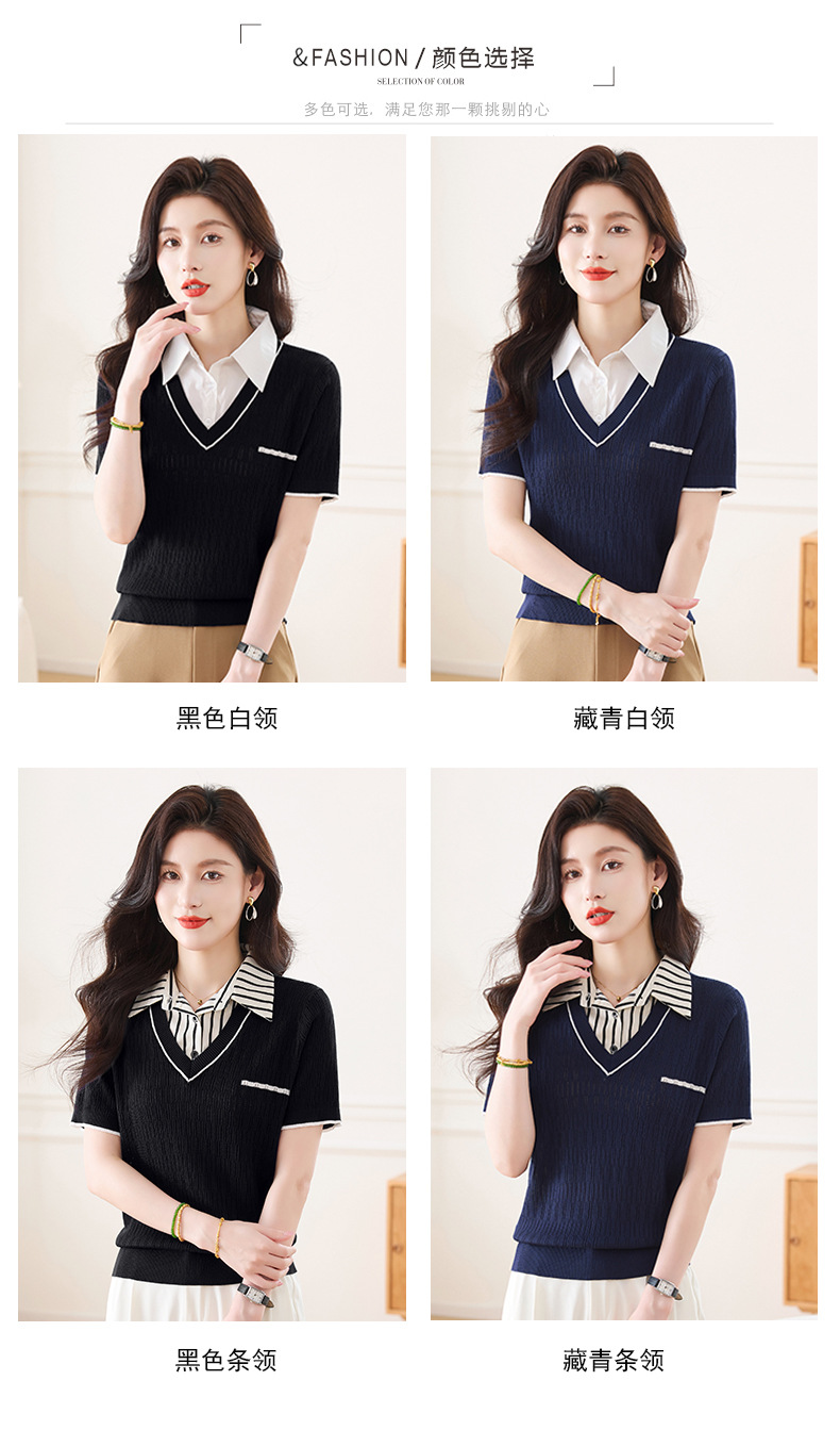 CC-66-2520衬衫领假两件上衣女夏季气质港风短袖t恤新款时髦洋气冰丝小衫