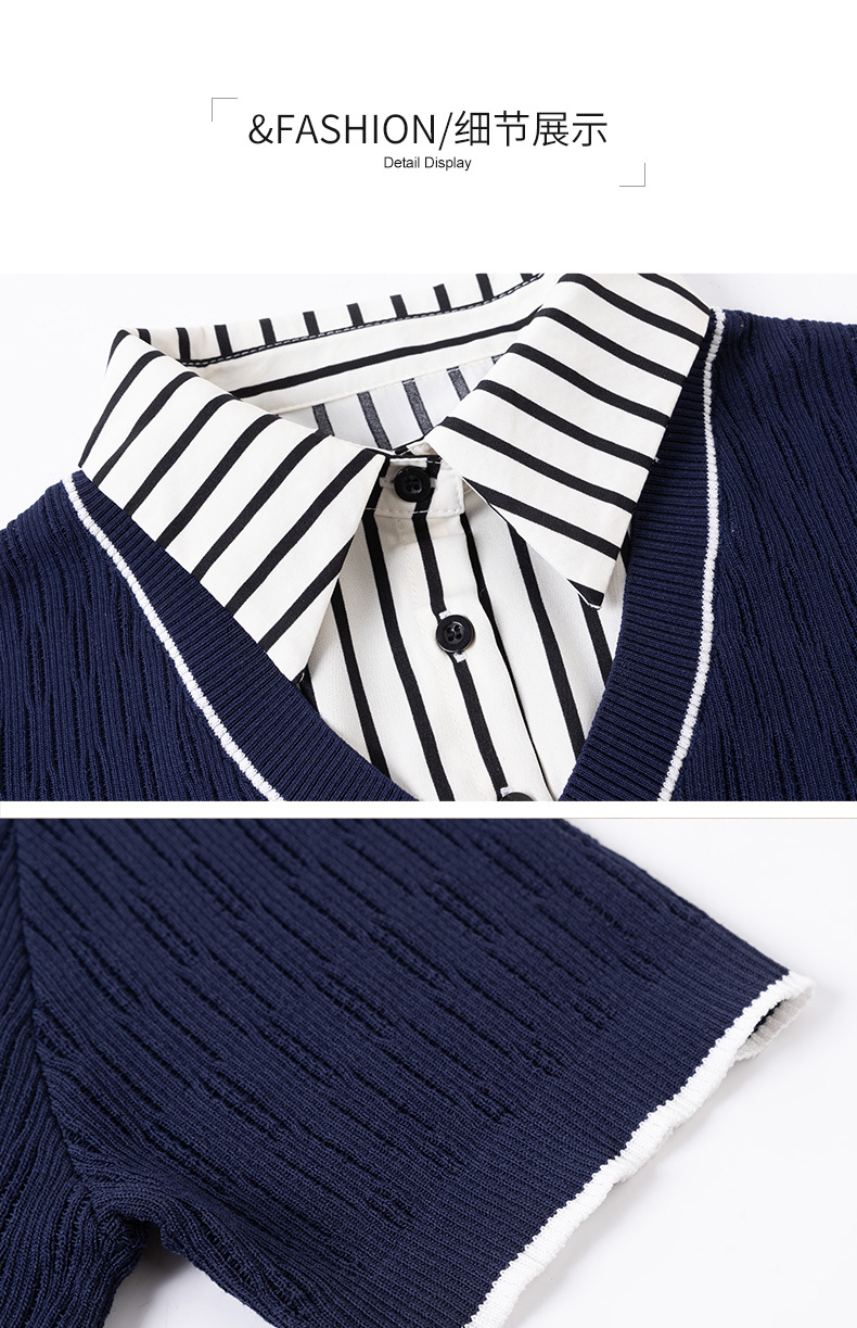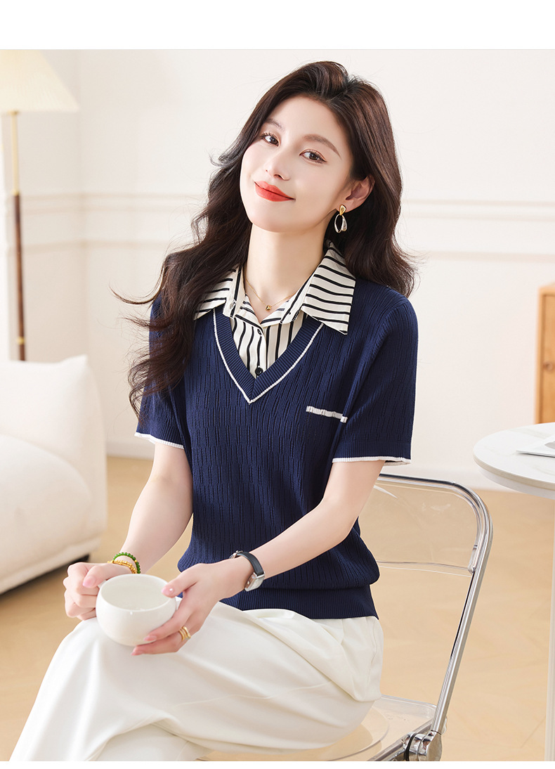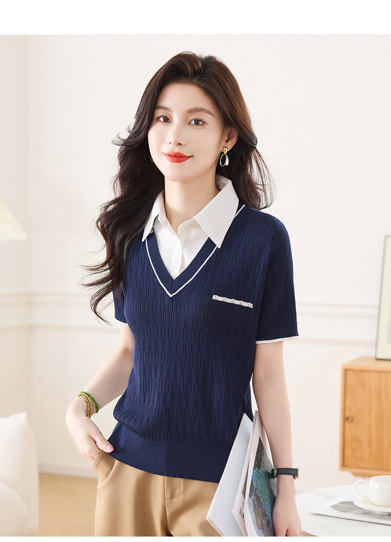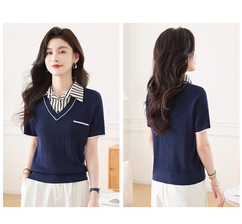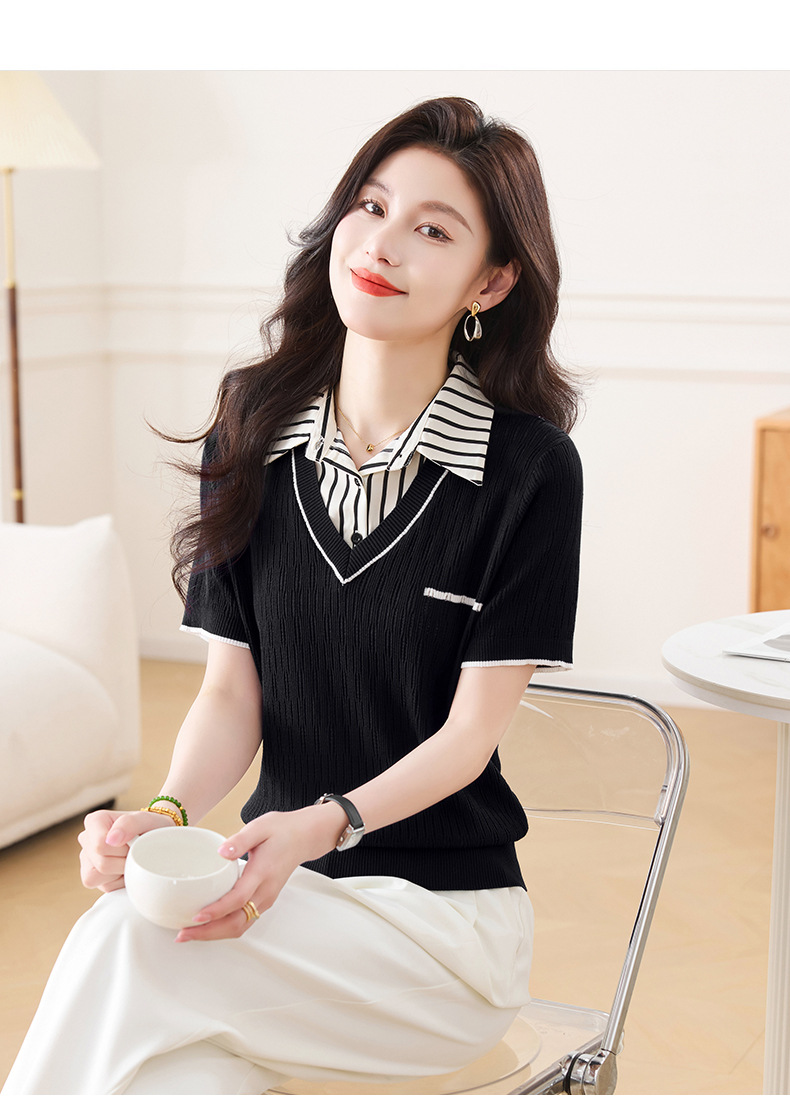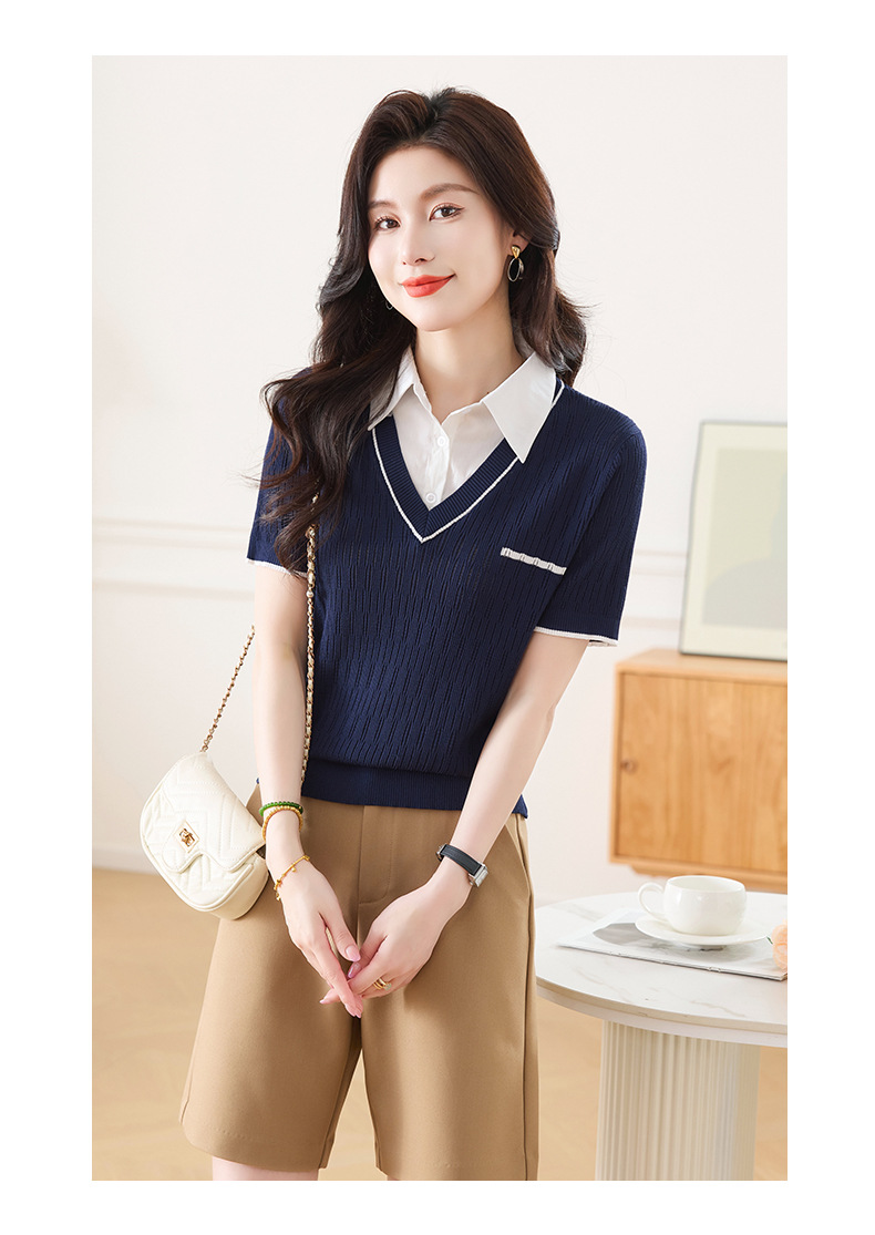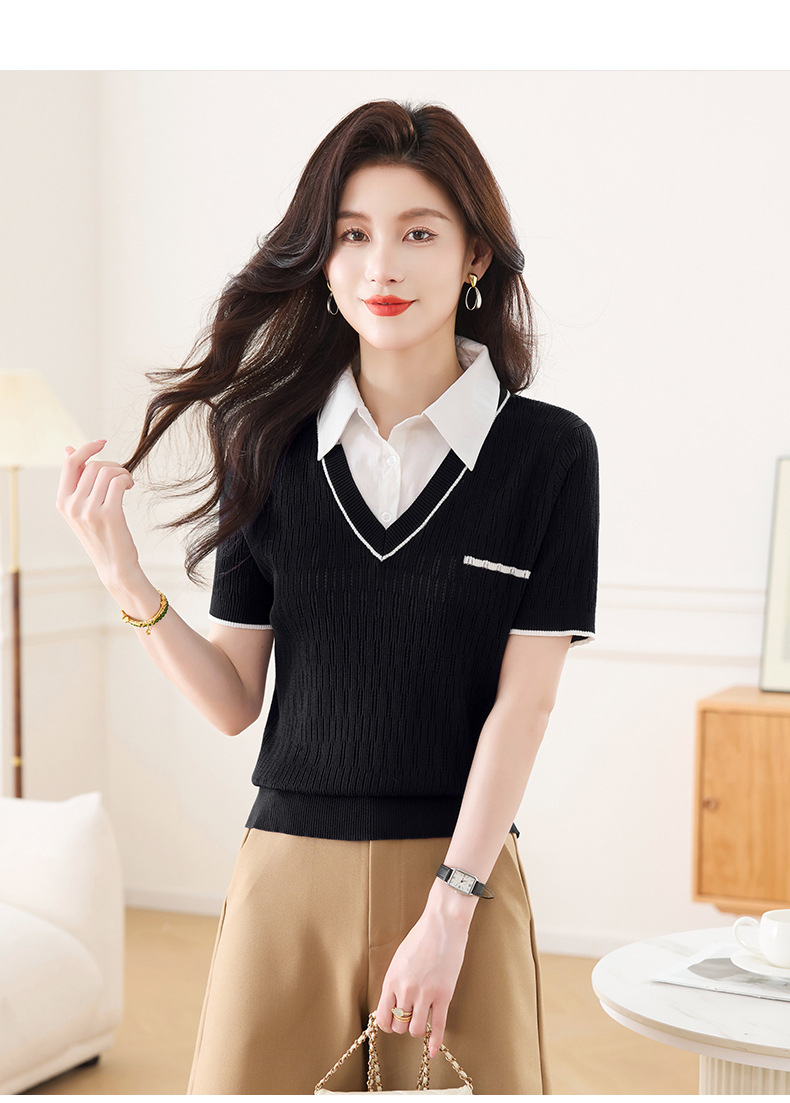 CC-66-2520衬衫领假两件上衣女夏季气质港风短袖t恤新款时髦洋气冰丝小衫