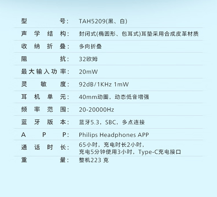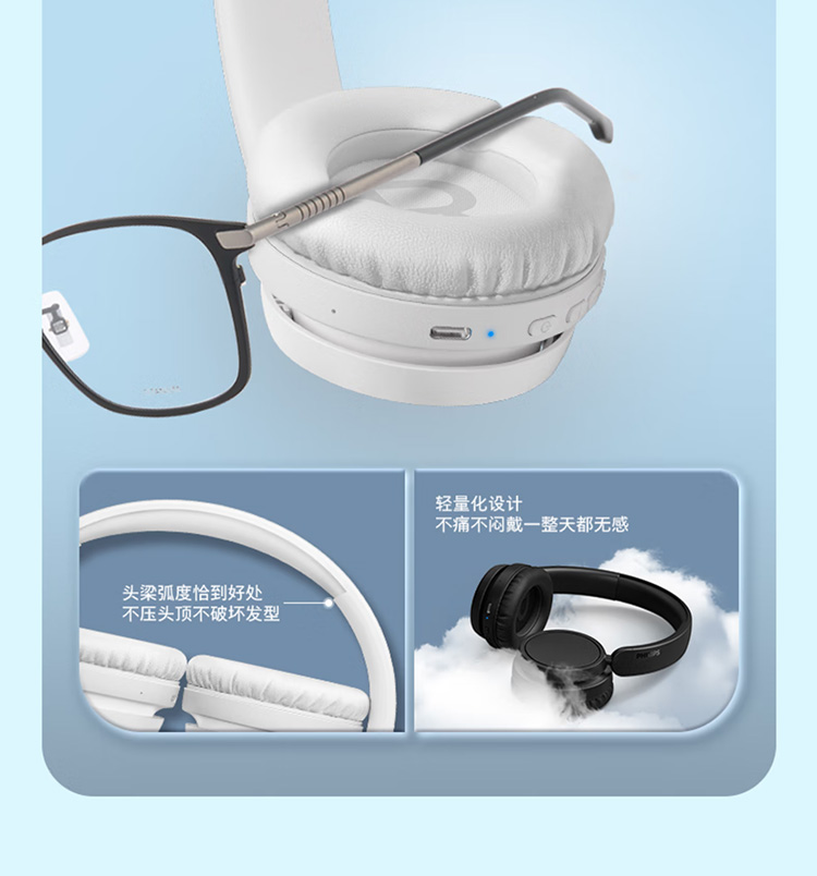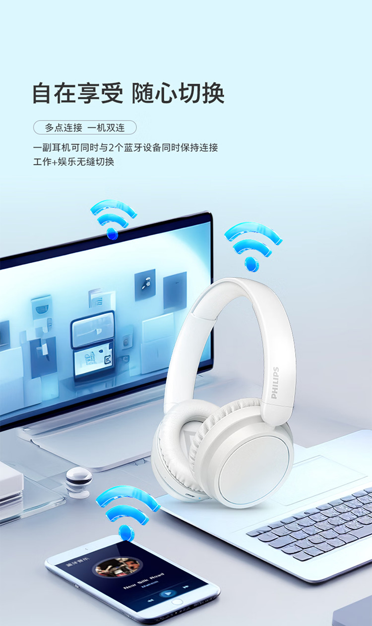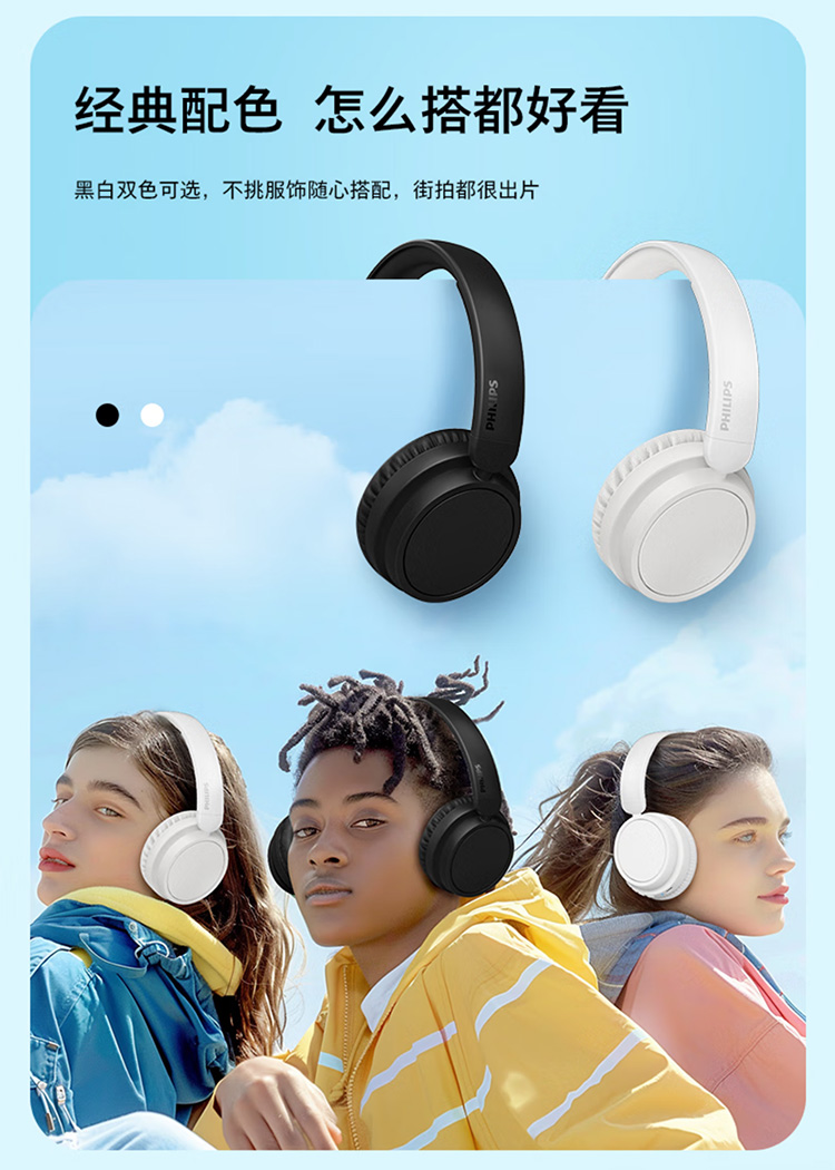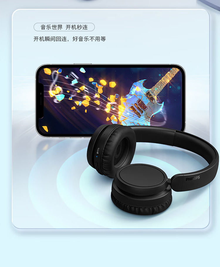 飞利浦PHILIPS头戴式无线蓝牙耳机65小时续航通话降噪苹果华为小米安卓手机通用TAH5209黑色