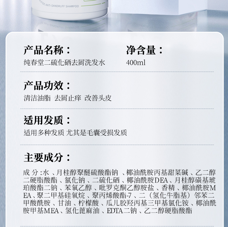 纯春堂1%二硫化硒洗发水控油去屑止痒毛囊清洁除螨清痘洗发露 400ml