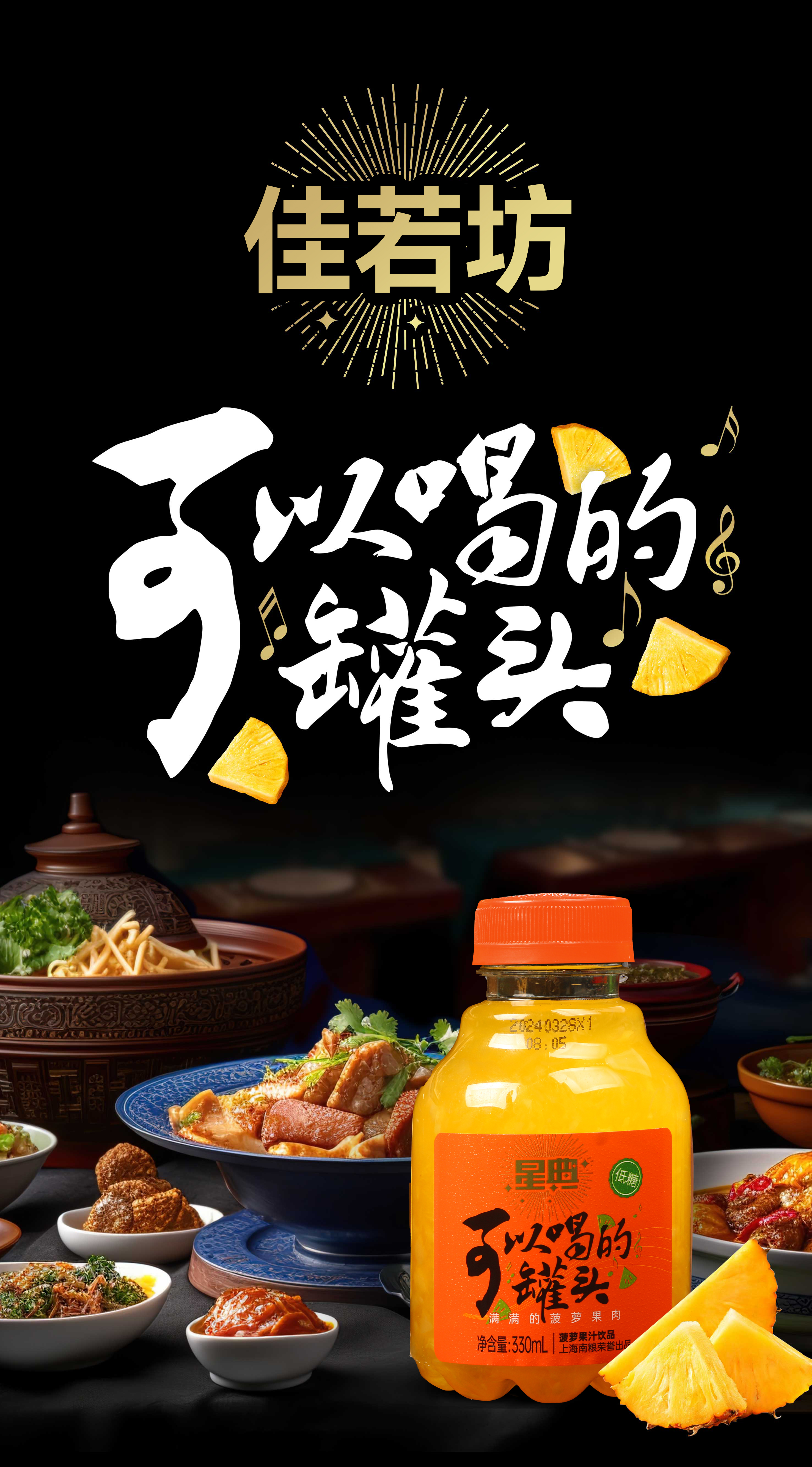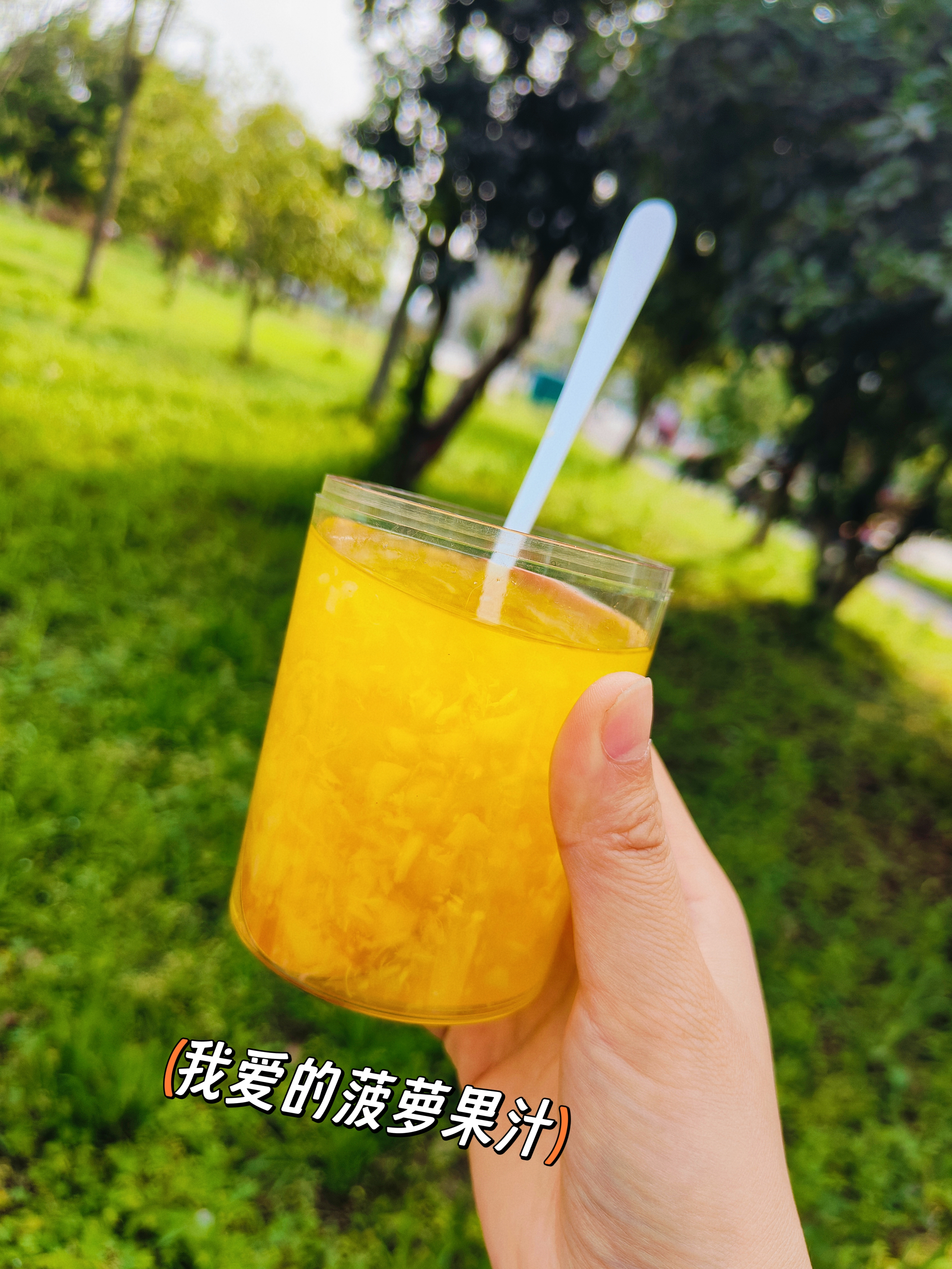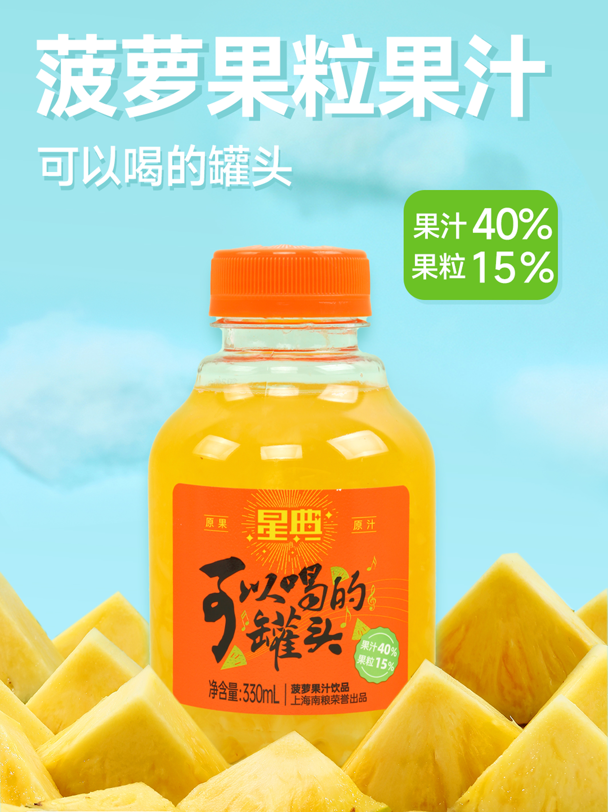 配料:水,菠萝粒(150g/L),果葡糖浆,白砂糖,浓缩菠萝汁,食品添加剂(柠檬酸,羧甲基纤维素钠,黄原胶,三氯蔗糖,山梨酸钾,维生素c,β-胡萝卜素)