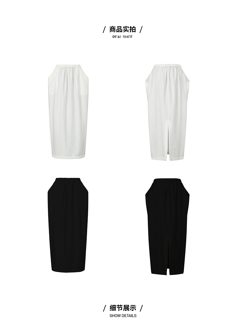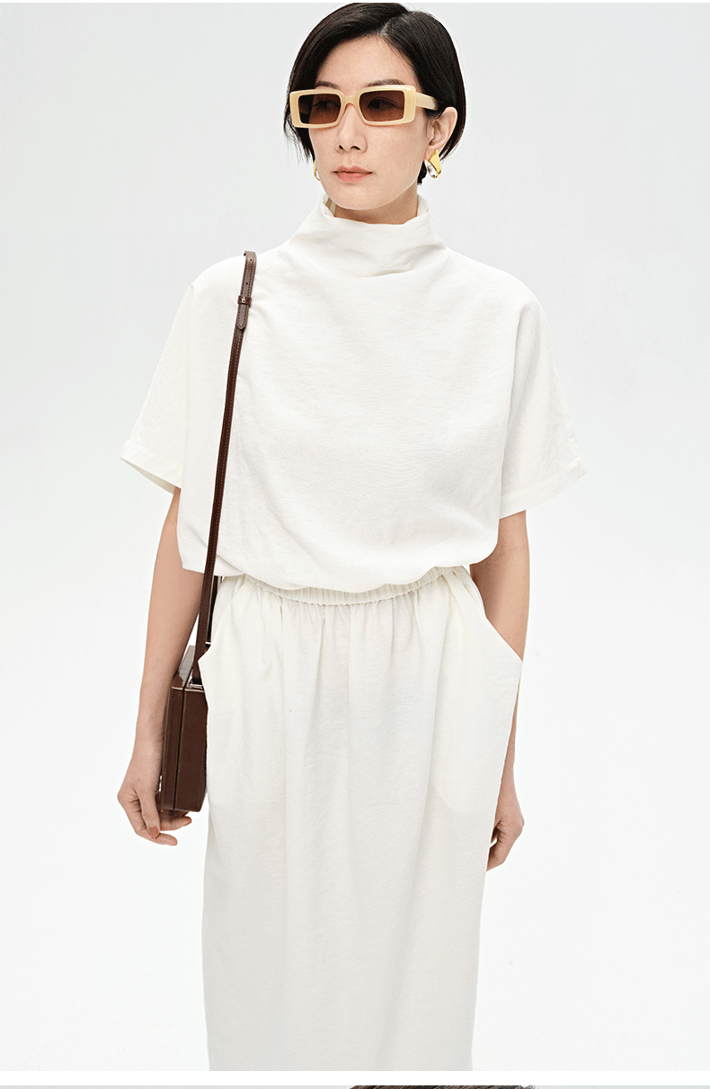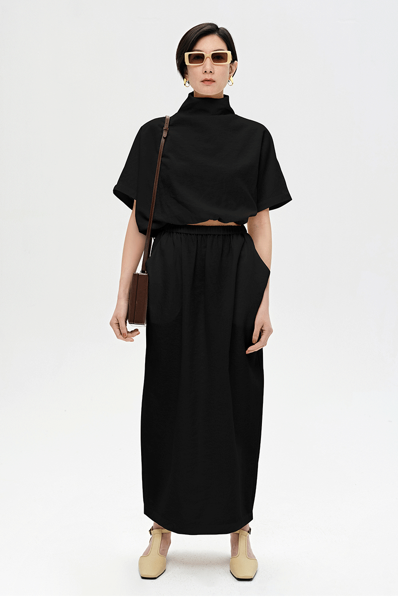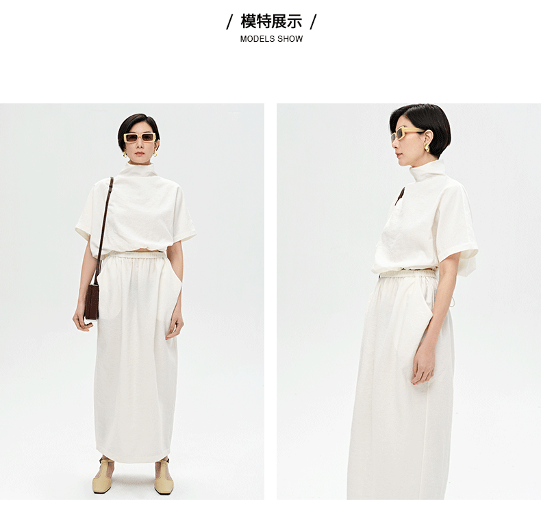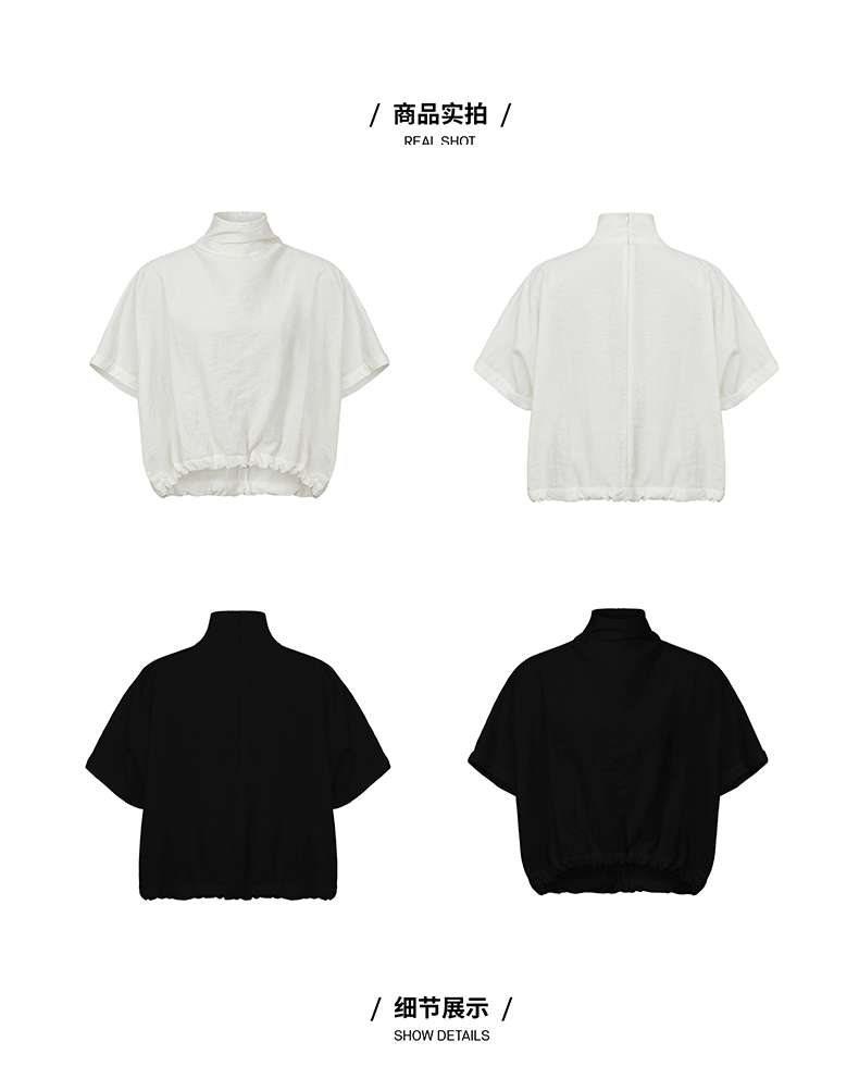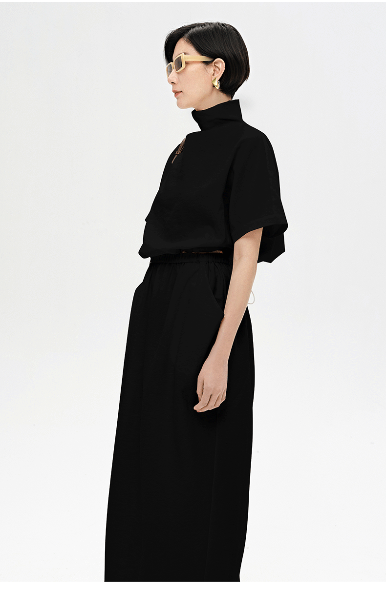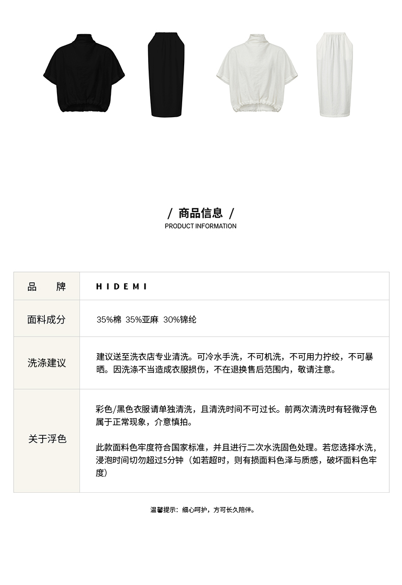 HIDEMI 简约设计感微荡立领半袖廓形套装 黑色/白色 上衣/半身裙