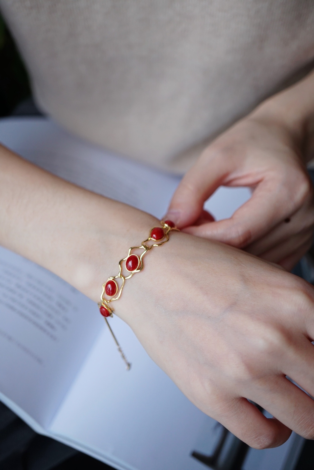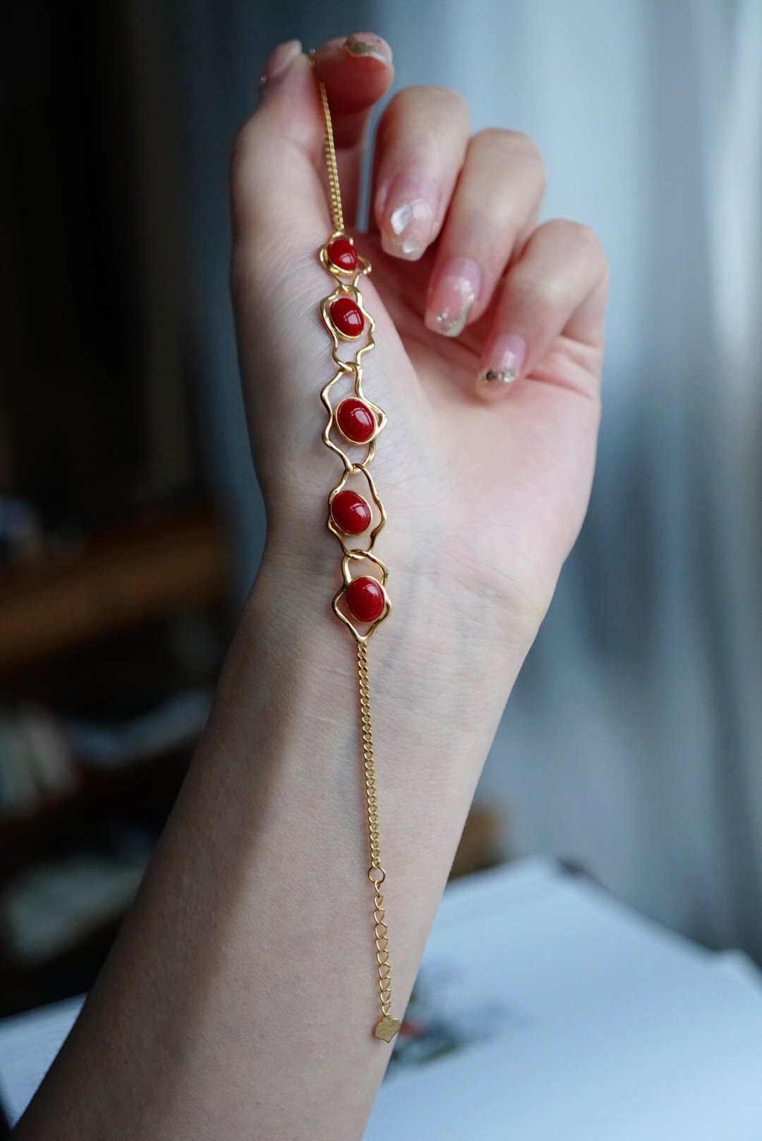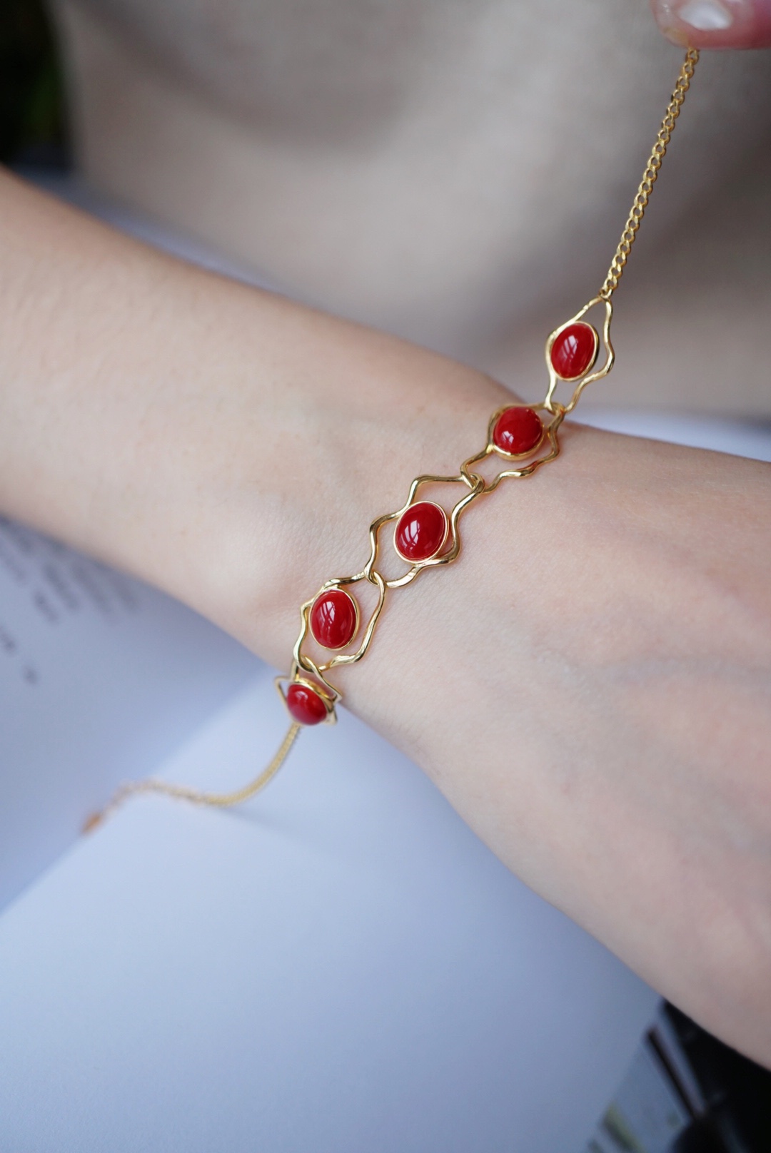 477096 18k金镶阿卡牛血红珊瑚·手链 极简大牌风,独家设计新品。 不规则几何设计,18k金精工打造。 裸石取一7.3*5.9mm,总长16.5+2.5cm延长链 超值价💰5980