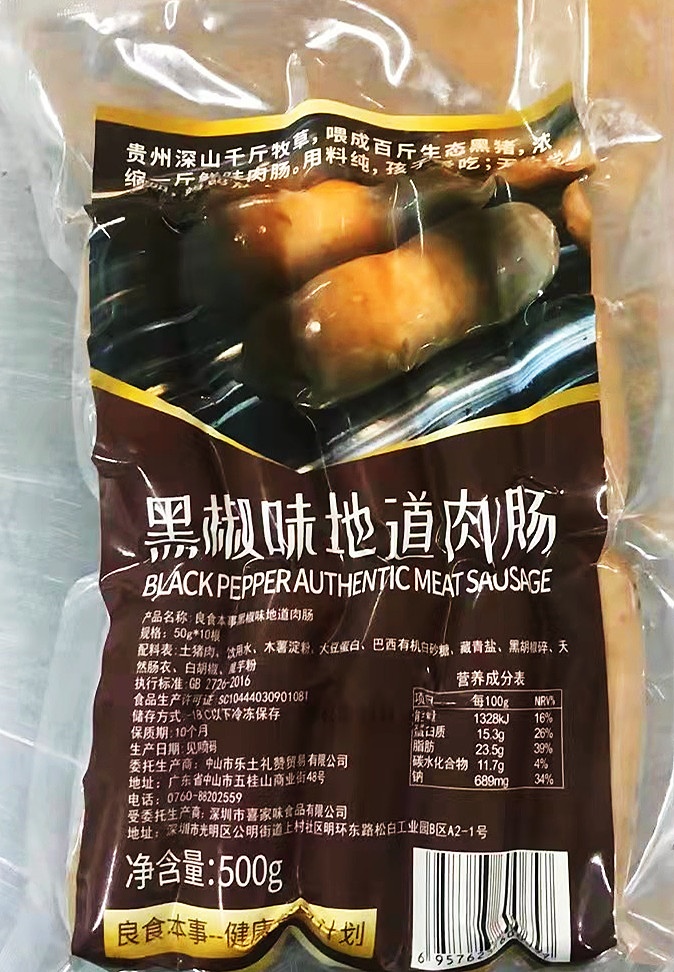 黑胡椒味烤肠:土猪肉、饮用水、木薯淀粉、大豆蛋白、巴西有机白砂糖、藏青盐、黑胡椒碎、天然肠衣、白胡椒、魔芋粉