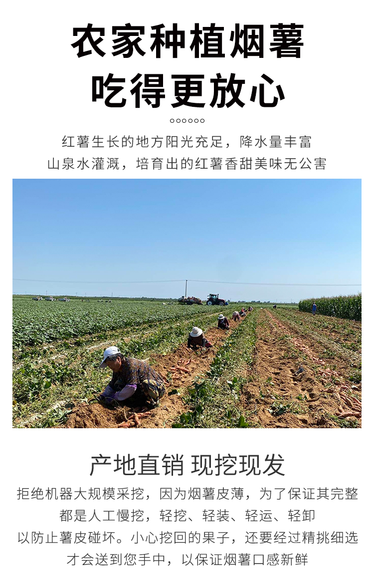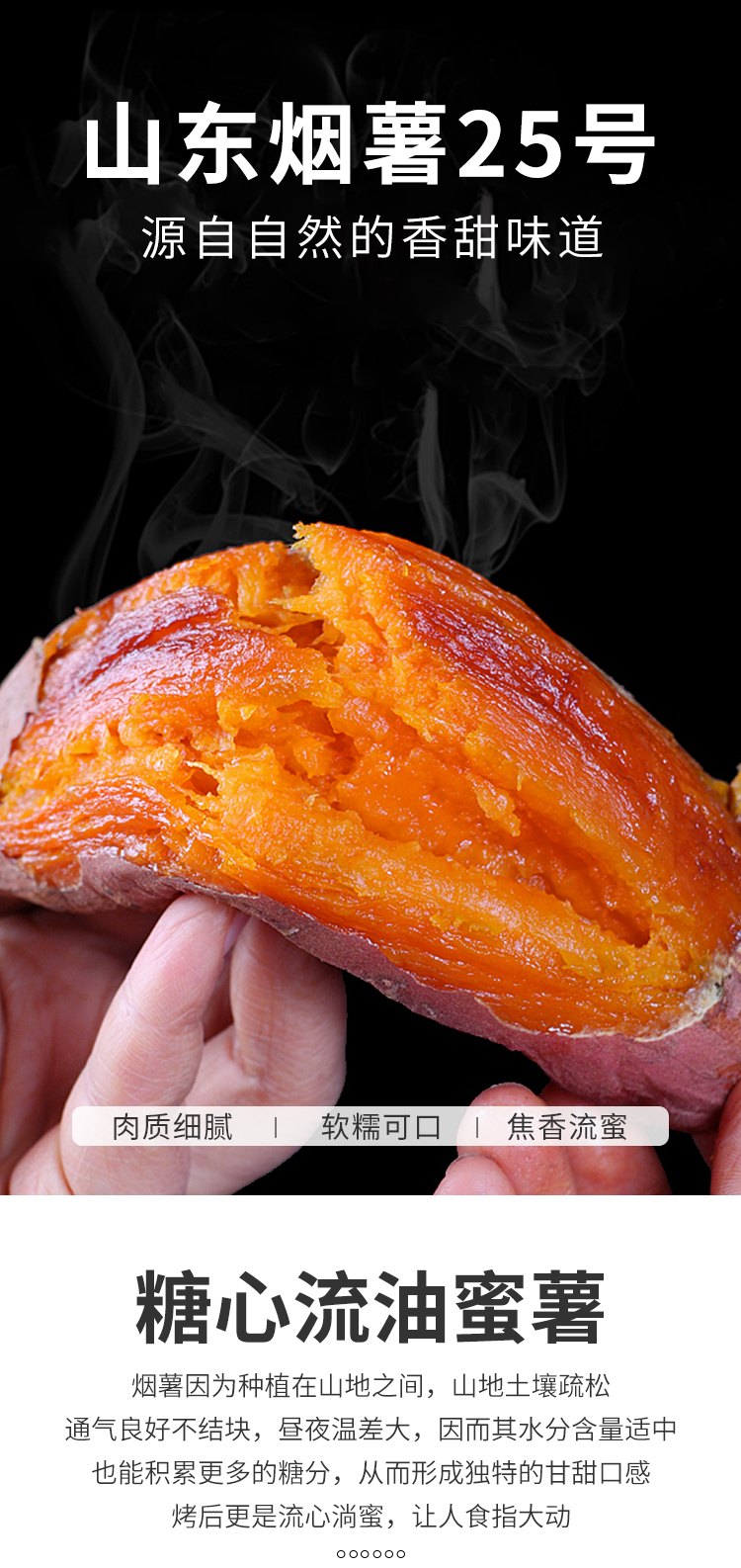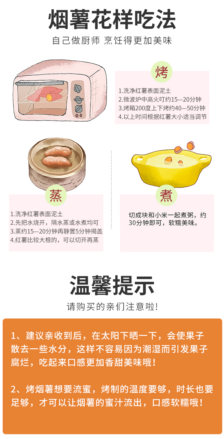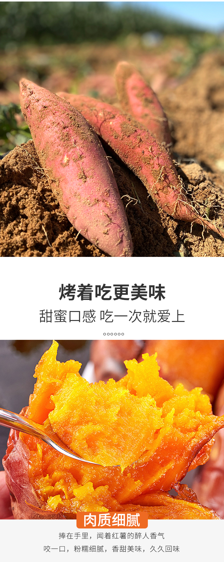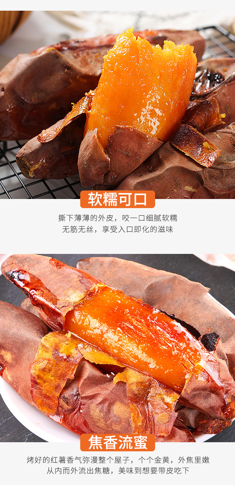 烟薯来袭 适合烤制,软、糯、香、甜! 烤出来爆浆, 香甜软糯,口感细腻 吃上一口,软糯的薯肉,香甜的味道顺着食道轻轻地往下滑,满足感爆棚啊!
